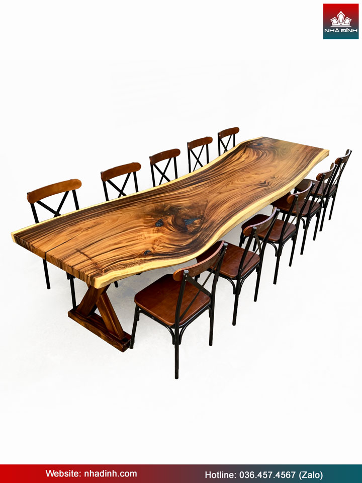 Bàn Ăn 10 Ghế Gỗ Me Tây Nguyên Khối Dài 354 Rộng 95-85-92 Dày 6,7 Cao 75 (cm)