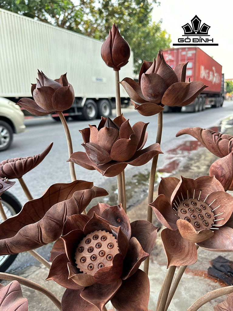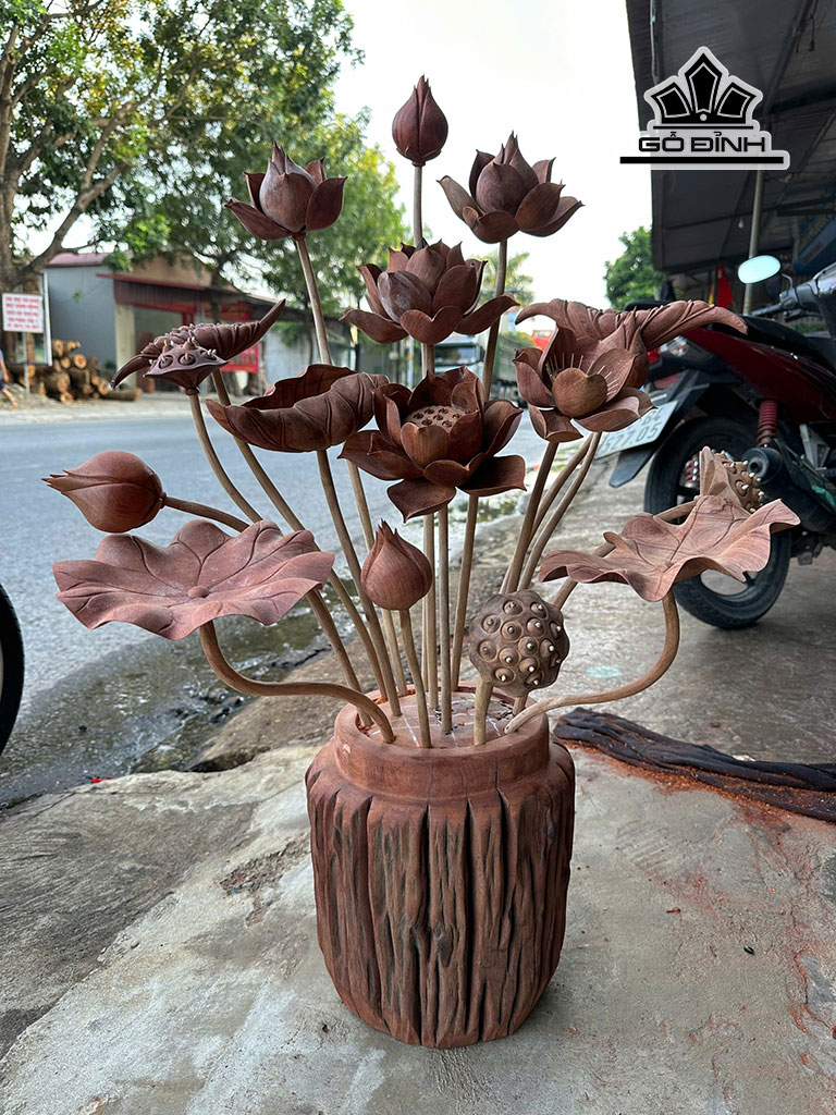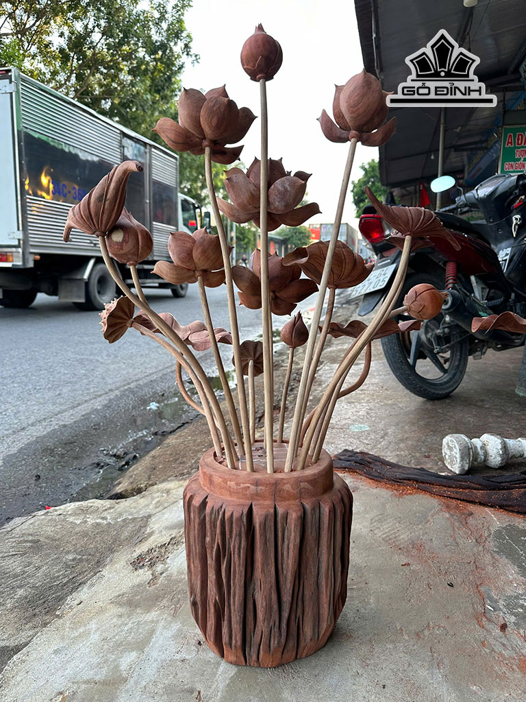 Bình Hoa Sen Gỗ Hương 17 Cành Cao 90 Xòe 60 - Kích Thước Bình Cao 30 Đường Kính 29 (cm)