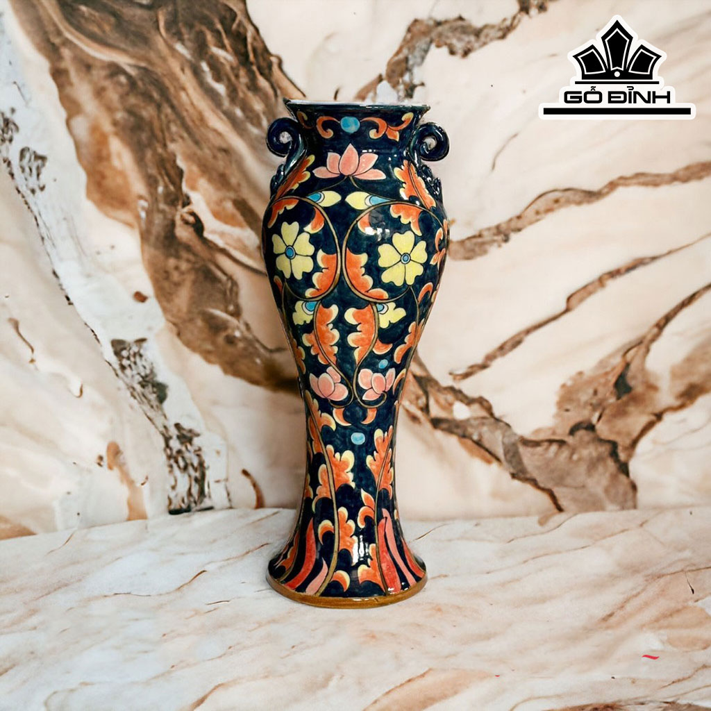 Bình Hoa Vẽ Kĩ Men Lam Tây Gốm Bát Tràng Cao 32 Miệng 10 (cm)