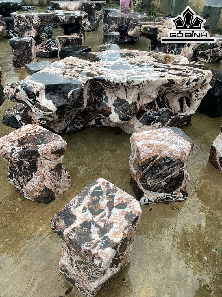Bộ Bàn 6 Đôn Đá Hoa Báo Đỏ Bàn Cao 60 Ngang 89 Dài 153 (cm)