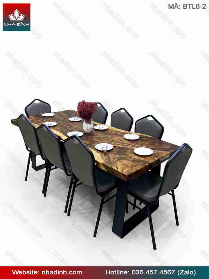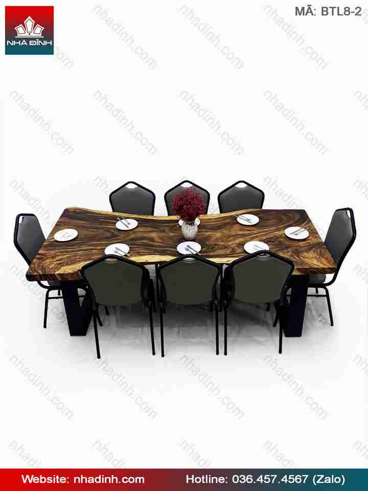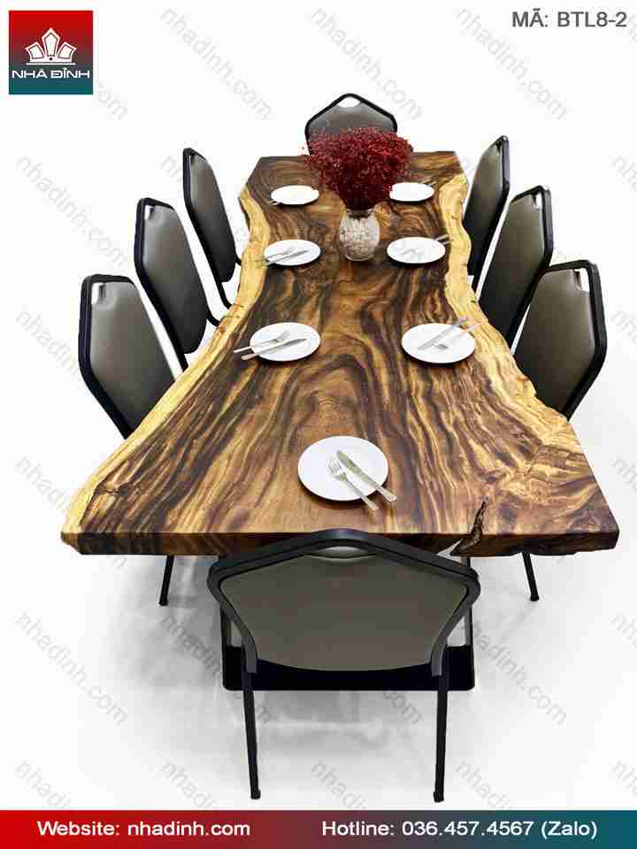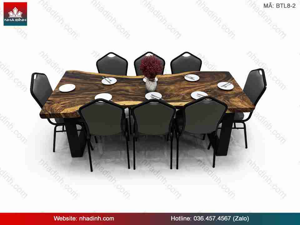 Bộ Bàn Ăn 8 Ghế Gỗ Me Tây Nguyên Tấm dài 2100 rộng 845-680-1000 dày 63 (mm)