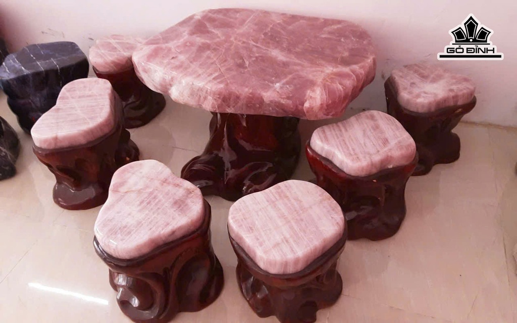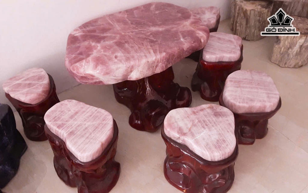 Bộ Bàn Ghế Đá Thạch Anh Hồng Kích Thước 105-71-13 Đôn Bàn Cao 43 Đôn Ghế Cao 41 Đường Kính Ghế 35 (cm) (CS)