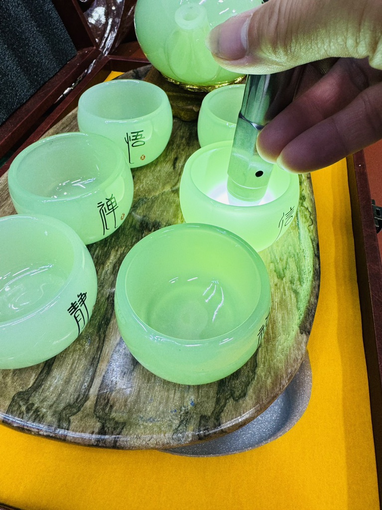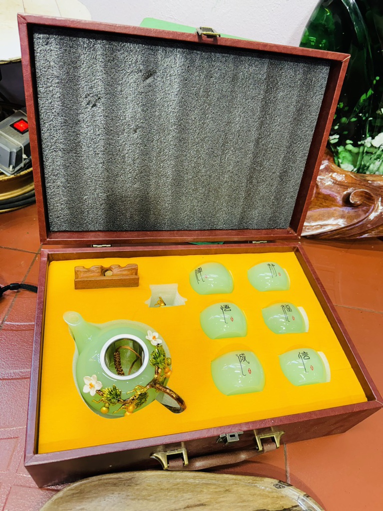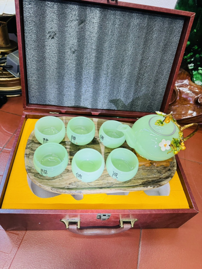 Bộ Bình Ly Đá Onyx Xanh Bình Cao 18 Ly Cao 8 Khay Gỗ Hóa Thạch Dài 32 Ngang 20 (cm)