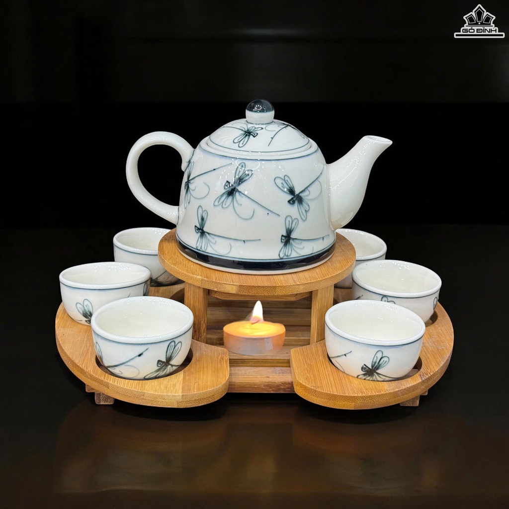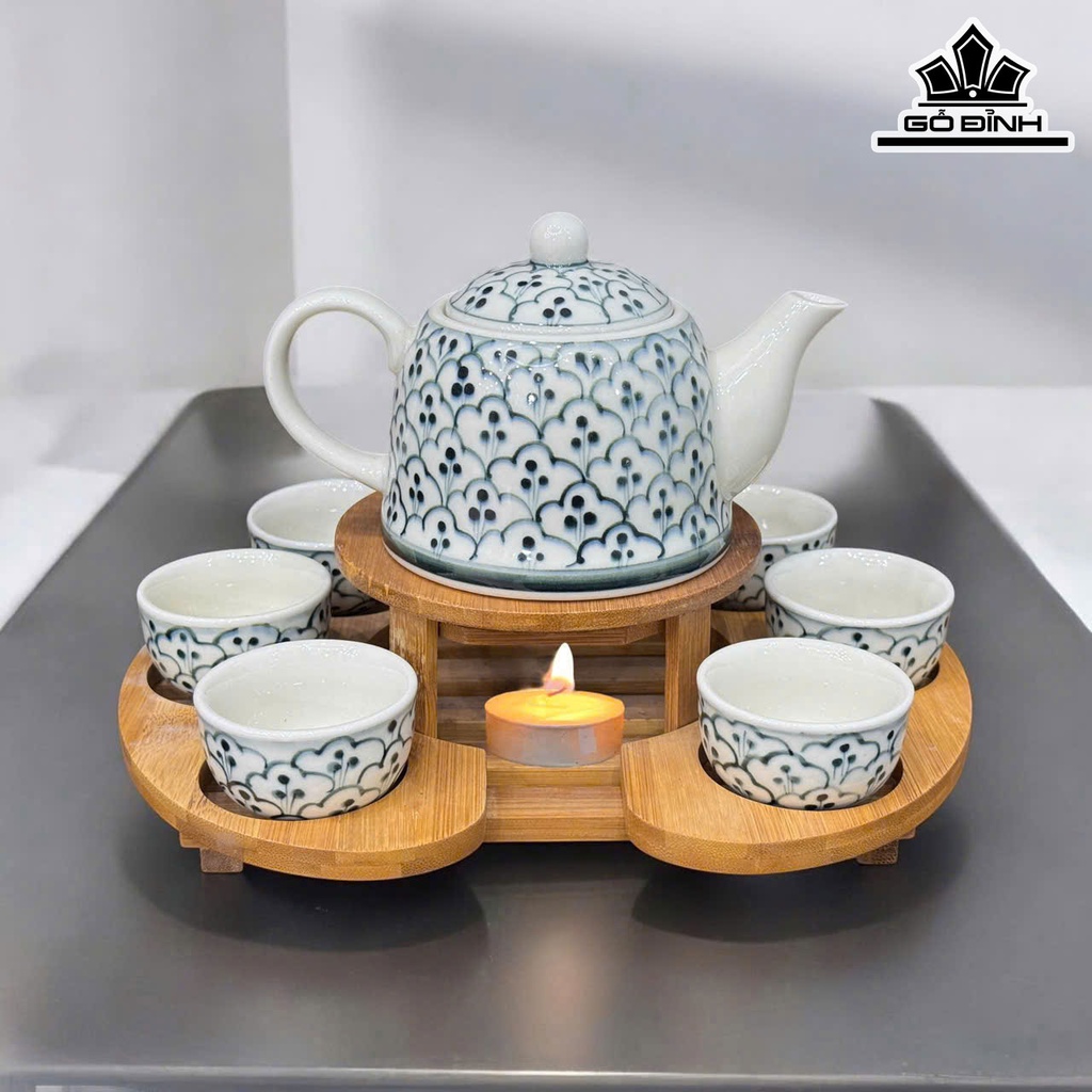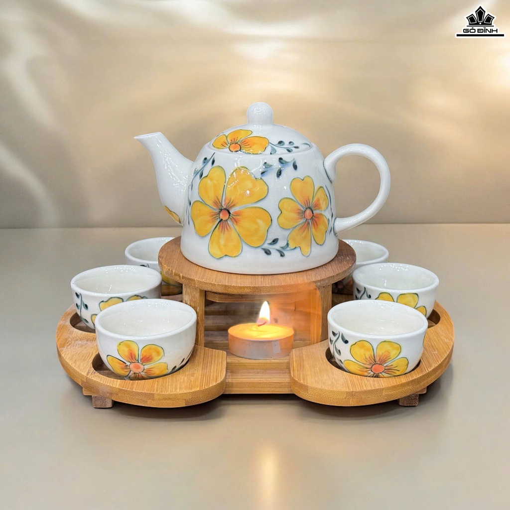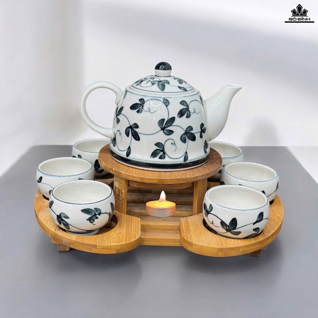 Bộ Trà Ấm Họa Tiết Gốm Bát Tràng 400ml - Kèm Khay Tre