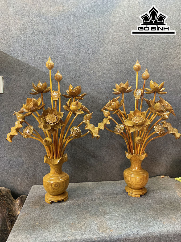 Cặp Bình Hoa Sen 17 Bông Gỗ Cẩm Vàng Cao 82 Ngang 55 Sâu 45 (cm)