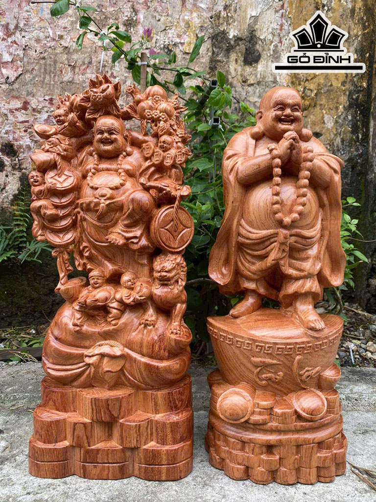 Cặp Tượng Di Lặc Chúc Phúc Và Di Lặc Gánh Đào Gỗ Hương Cao 50 Ngang 12 Sâu 20 (cm)