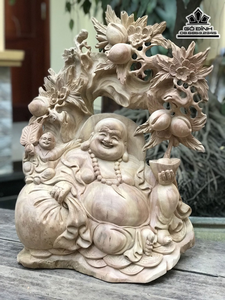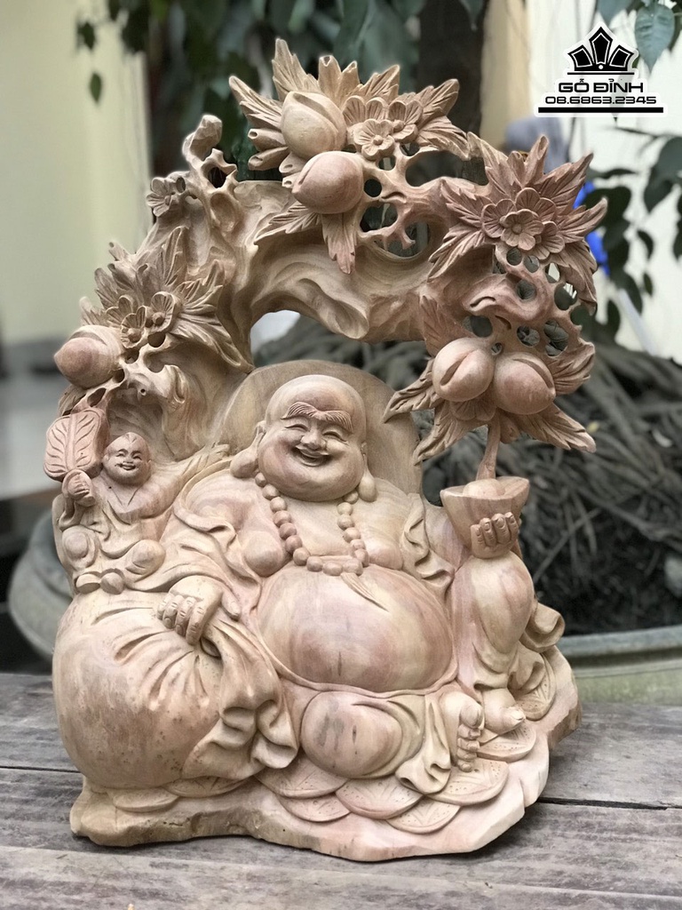 Di Lặc Ngồi Gốc Đào Gỗ Xá Xị (Gù Hương) Cao 55 Ngang 40 Sâu 24 (cm)