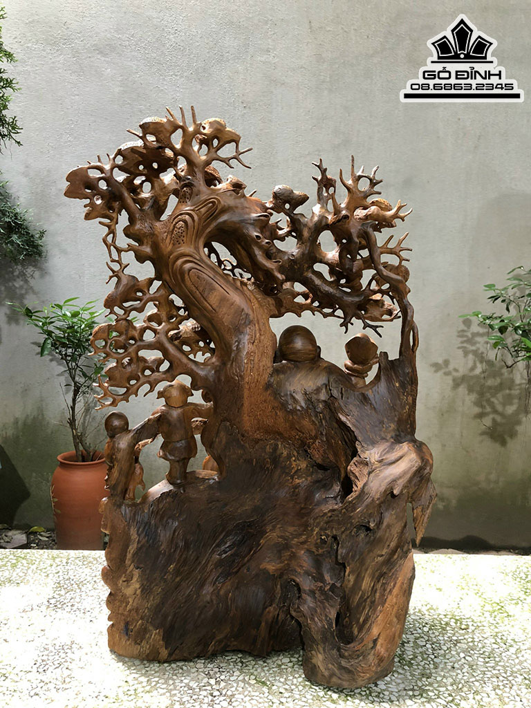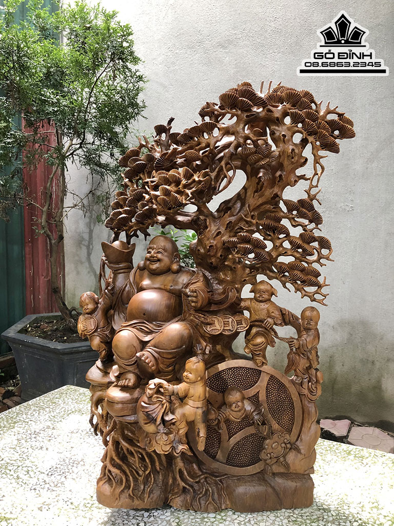 Di Lặc Ngồi Gốc Tùng Gỗ Bách Xanh Cao 75 Ngang 50 Sâu 35 (cm)