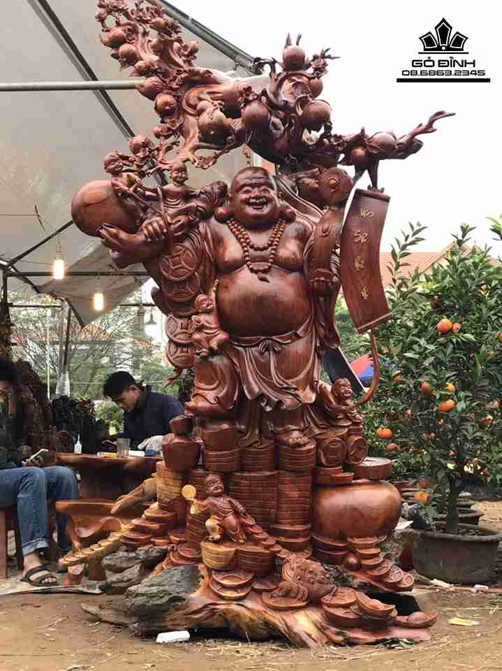 Di Lặc Vác Cành Đào Ngũ Phúc Gỗ Hương Cao 270 Rộng 150 Dày 120 (cm)