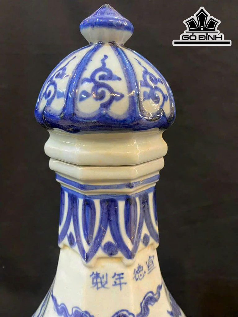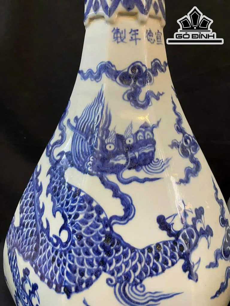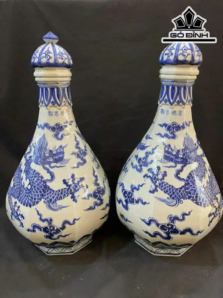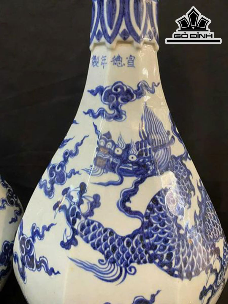 Đôi Bình Dáng Hồ Lô Bát Giác Vẽ Rồng Gốm Tàu Cao 62 Đường Kính Bụng 98 (cm)