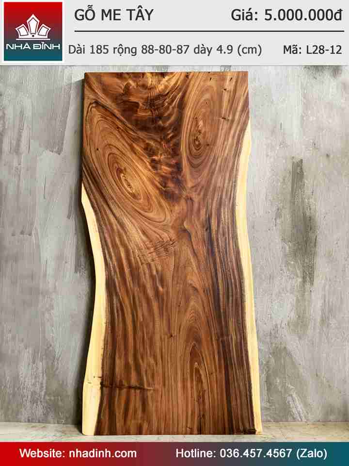 Mặt bàn gỗ me tây dai 185 rộng 88-80-87 day 4.9 (cm)