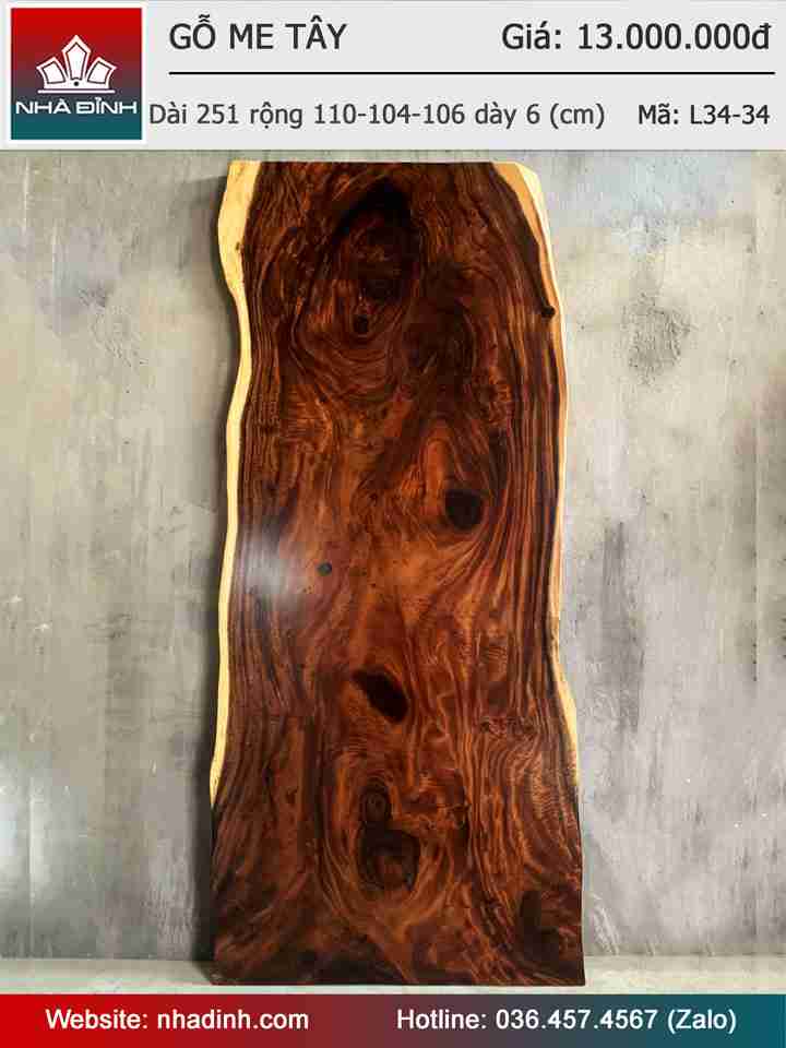 Mặt Bàn Gỗ Me Tây Nguyên Khối Dài 251 Rộng 110-104-106 Dày 6 (cm)