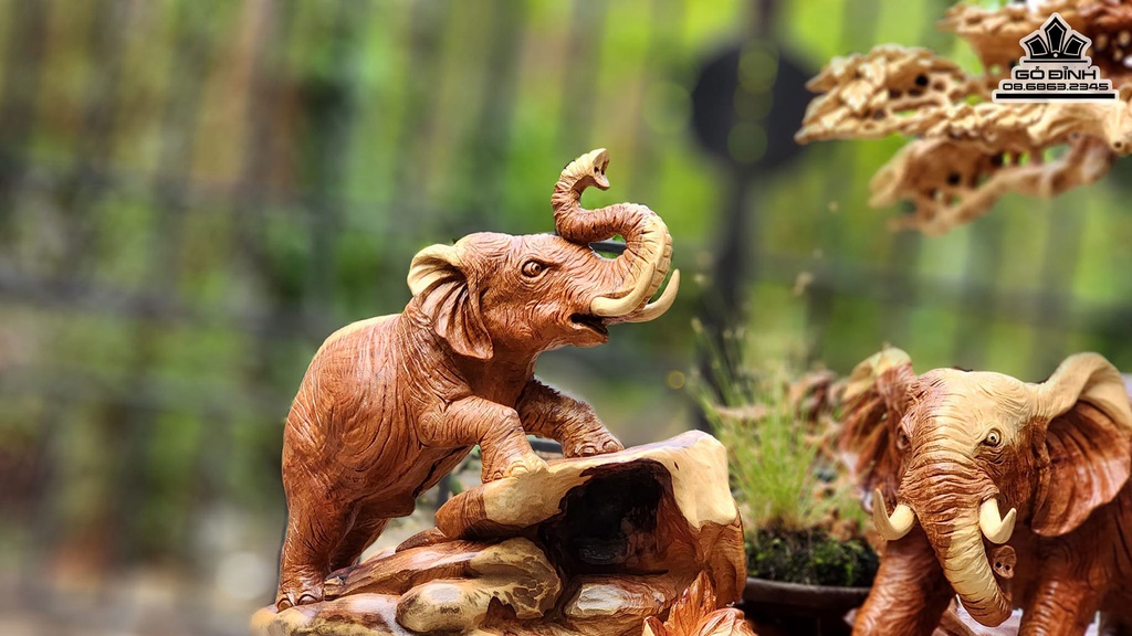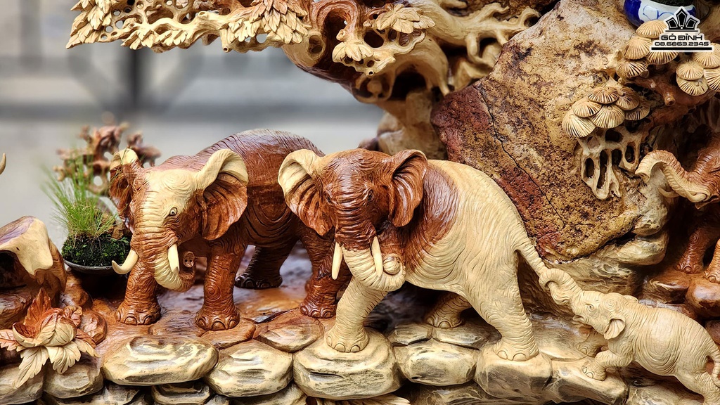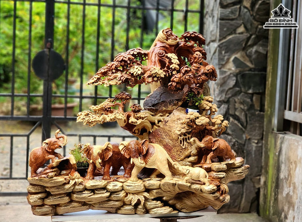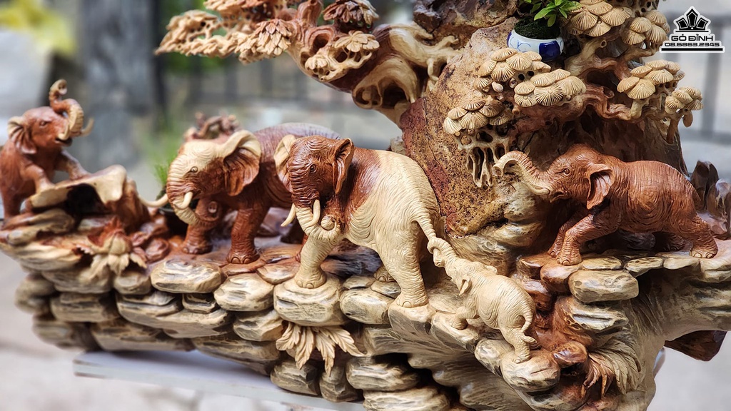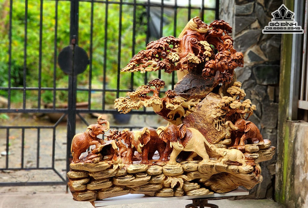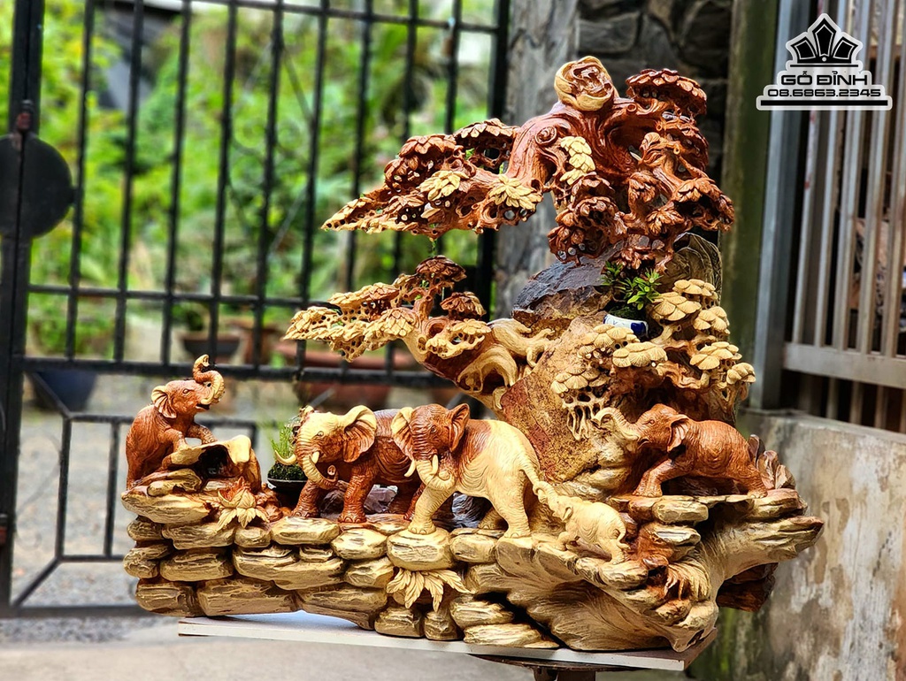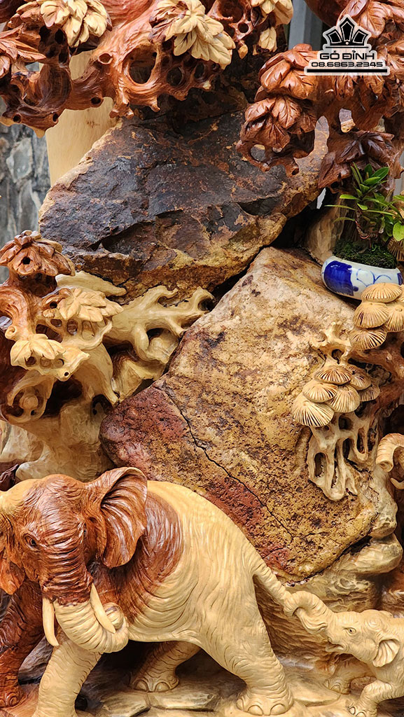Ngũ Voi Quần Tùng Gỗ Hương Ôm Đá