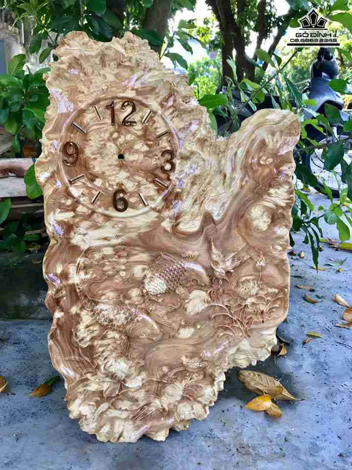 Đồng hồ cá chép gỗ nu nghiến cao 64 rộng 38 dày 2,7 (cm)