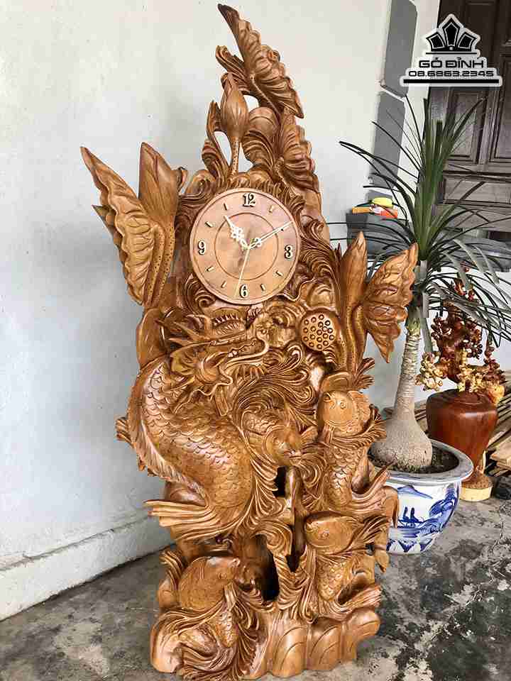 Đồng Hồ Cá Chép Hóa Rồng Gỗ Xá Xị ( Gù Hương ) Cao 122 Rộng 58 Sâu 32 (cm)