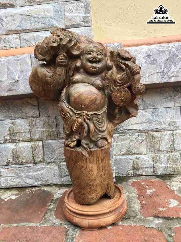Phật di lặc cầm bao tiền gỗ thủy tùng cao 59 (cả kỉ) ngang 37 sâu 15 (cm)