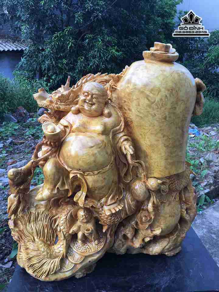 Phật di lặc cưỡi rồng gỗ nu kháo cao 72 rộng 66 dày 38 (cm)