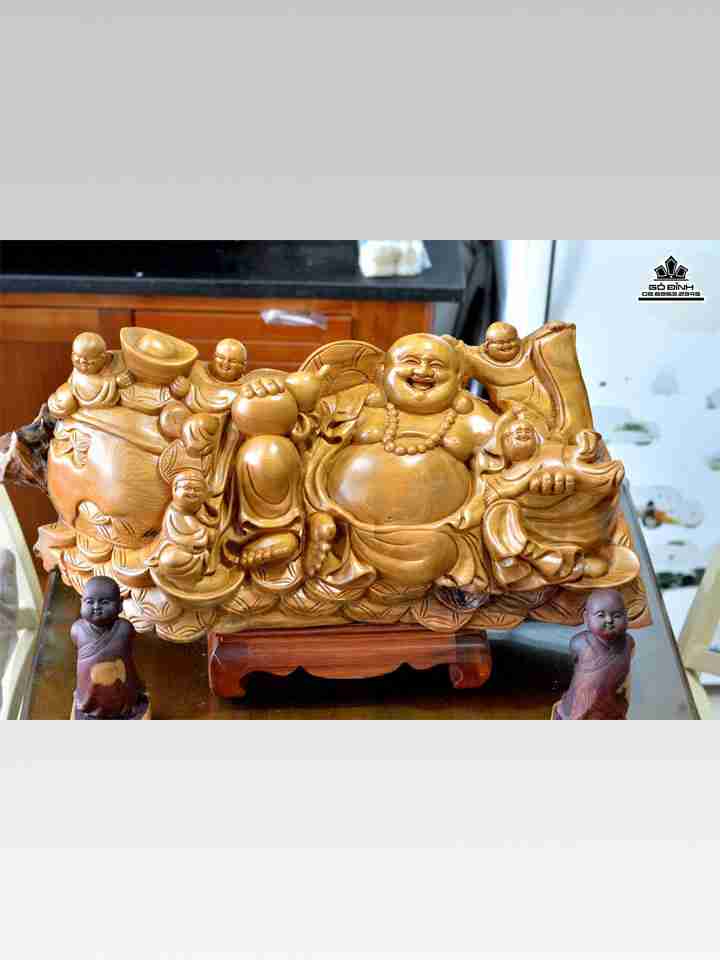 Phật di lặc và ngũ phúc gỗ bách xanh rộng 73 cao 28 dày 30 (cm)