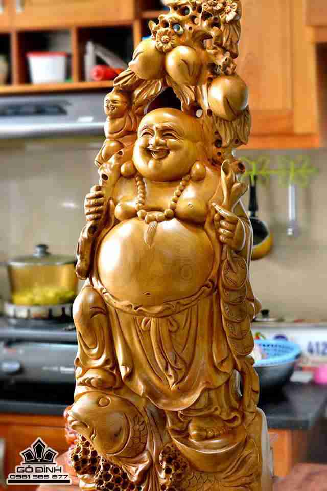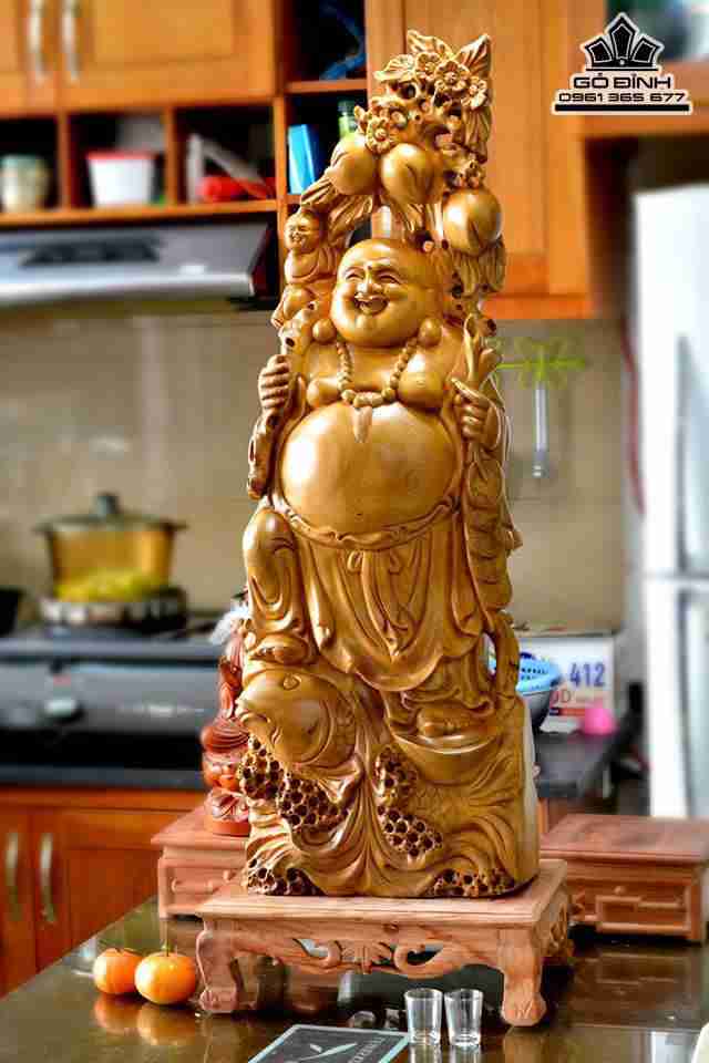 Phật di lặc vác cành đào gỗ bách xanh Sơn La. Phật Di Lặc vác cành đào là một hình tượng rất gần gũi. Mỗi khi cảm thấy mệt mỏi hay bắt gặp một công việc nào đó có áp lực nặng nề thì chỉ cần nhìn thấy vẻ mặt mỉm cười tươi rói của Phật Di Lặc thì sẽ giúp giải tỏa những cảm giác mệt mỏi, căng thẳng. Trong phong thủy thì Phật Di Lặc là biểu tượng của sự hạnh phúc viên mãn. Vì vậy mà việc trưng bày tượng Phật Di Lặc trong nhà sẽ giúp thu hút được tài lộc, và vượng khí vào nhà.
