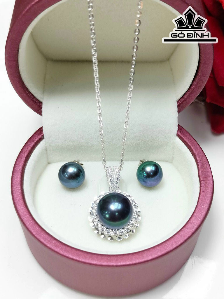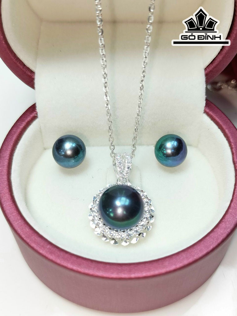 Set 3 Món Mặt Dây Chuyền Ngọc Trai Bán Cầu Xanh Đen Size 7-9 li