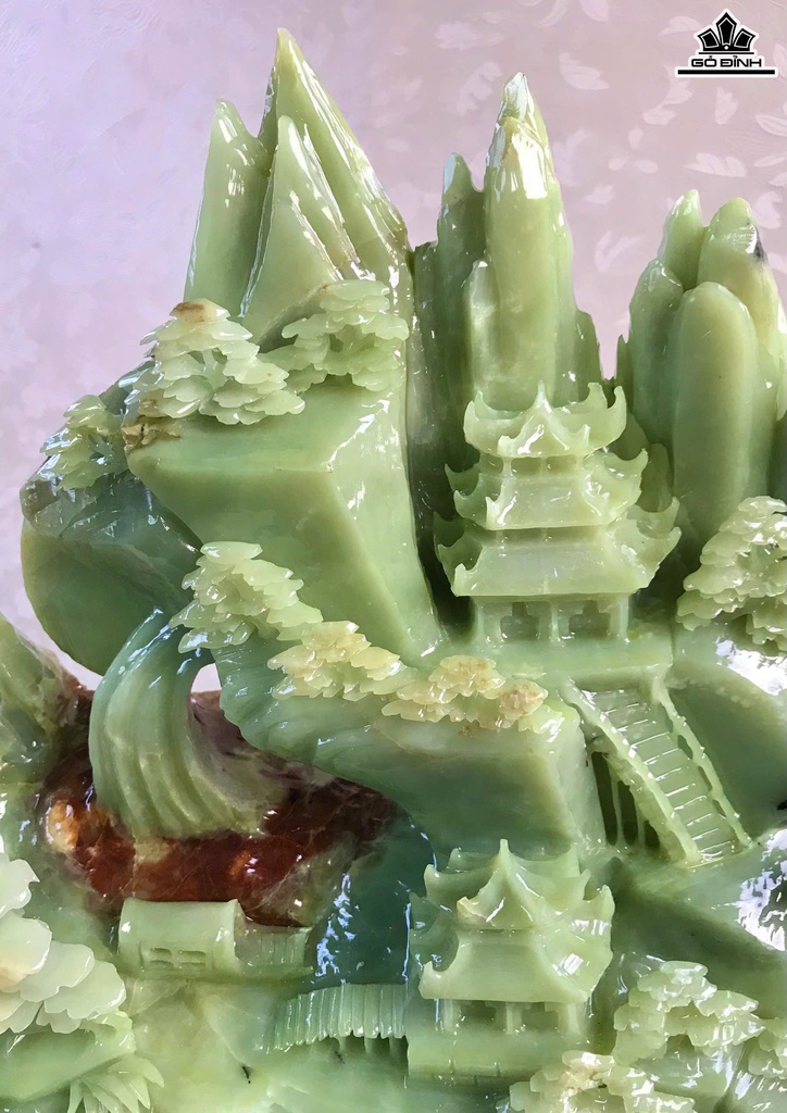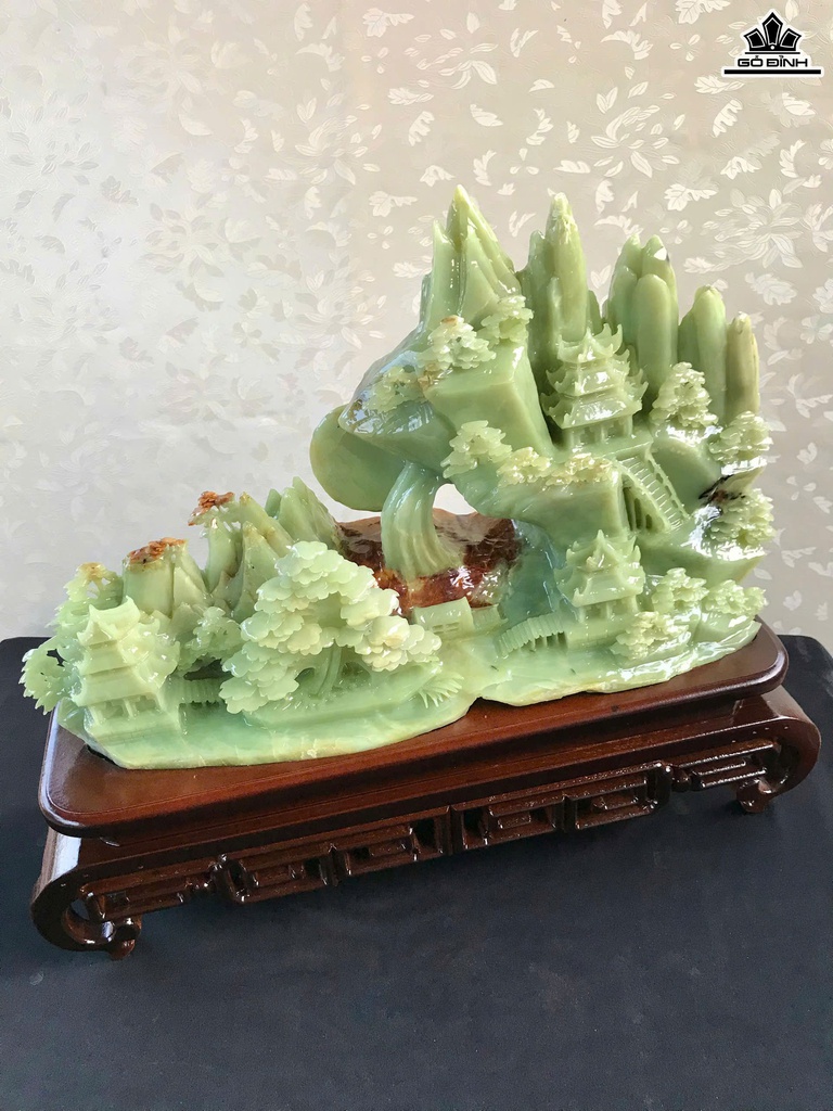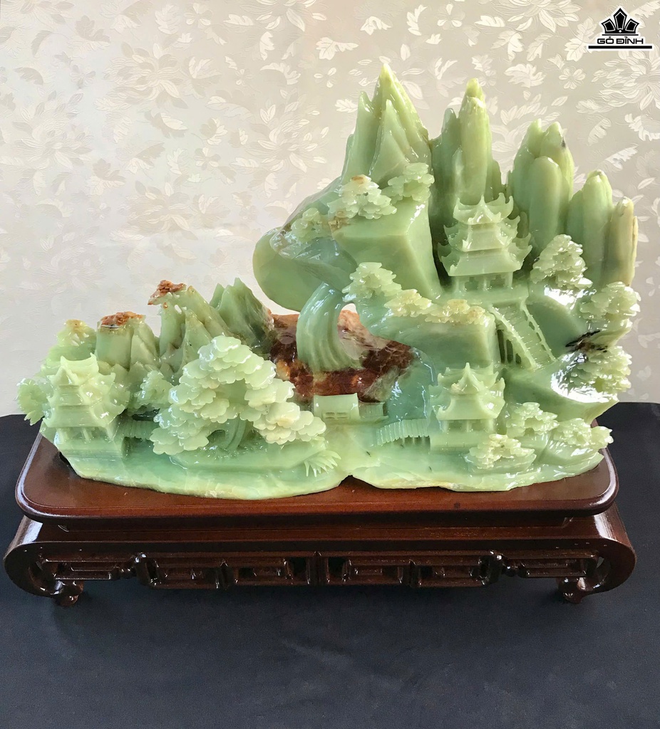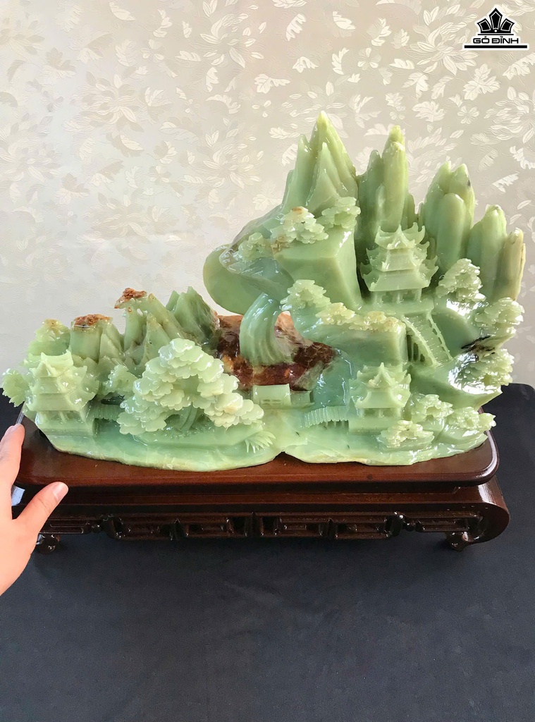 Tác Phẩm Bồng Lai Tiên Cảnh Đá Serpentine Cao 30 Ngang 45 Sâu 12,5 (cm) - Cả Đế Cao 40 (cm)