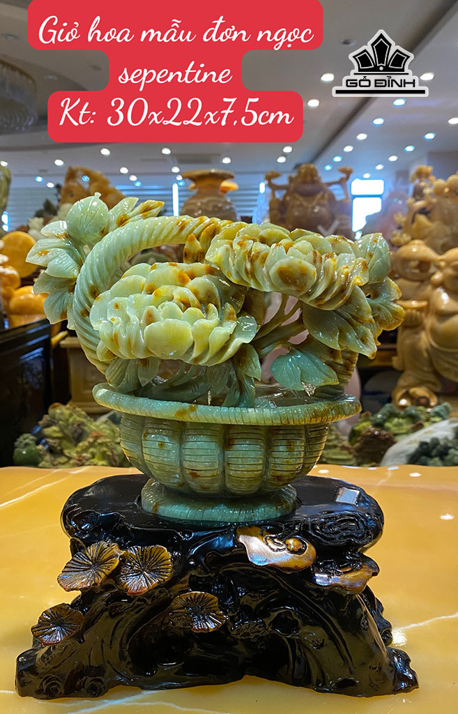 Tác Phẩm Giỏ Hoa Mẫu Đơn Đá Serpentine Cao 30 Ngang 22 Sâu 7,5 (cm)