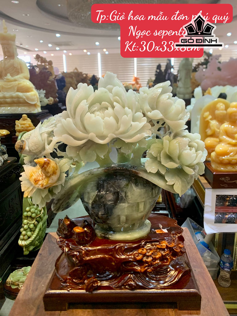 Tác Phẩm Giỏ Hoa Mẫu Đơn Phú Quý Đá Serpentine Cao 42 Ngang 33 Sâu 15 Riêng Đá Cao 30 Ngang 33 Sâu 8 (cm)