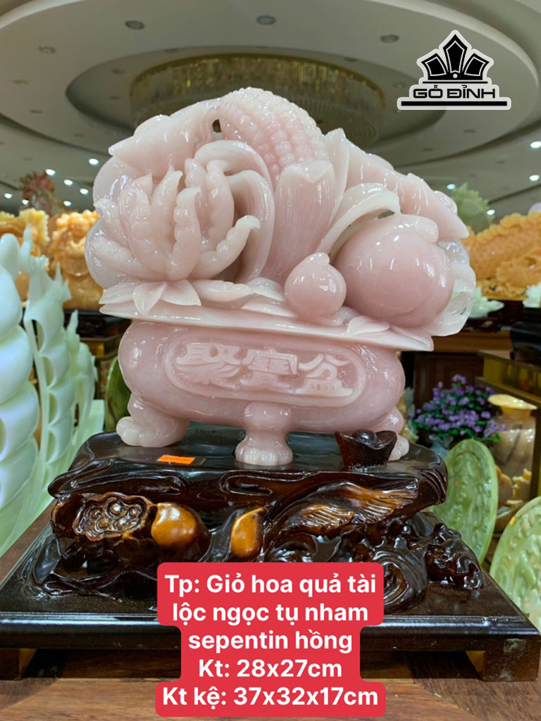 Tác Phẩm Giỏ Hoa Quả Tài Lộc Đá Serpentine Hồng Cao 37 Ngang 32 Sâu 17 Riêng Đá Cao 28 Ngang 27 (cm)