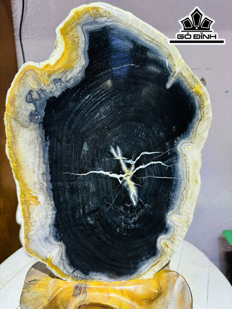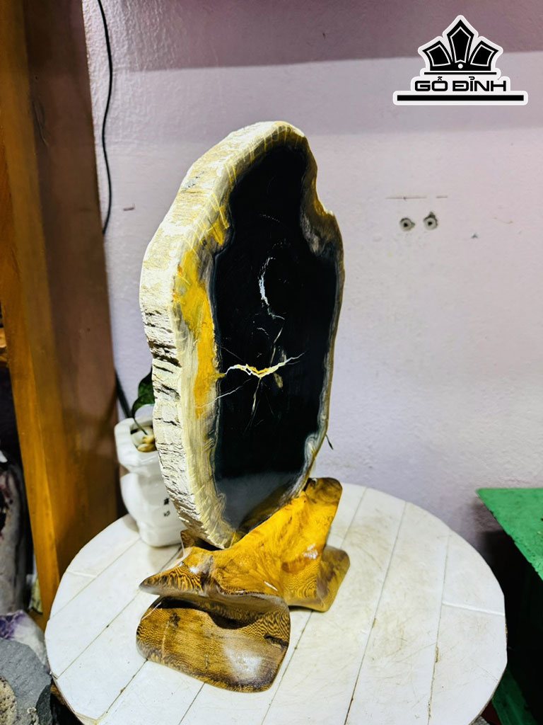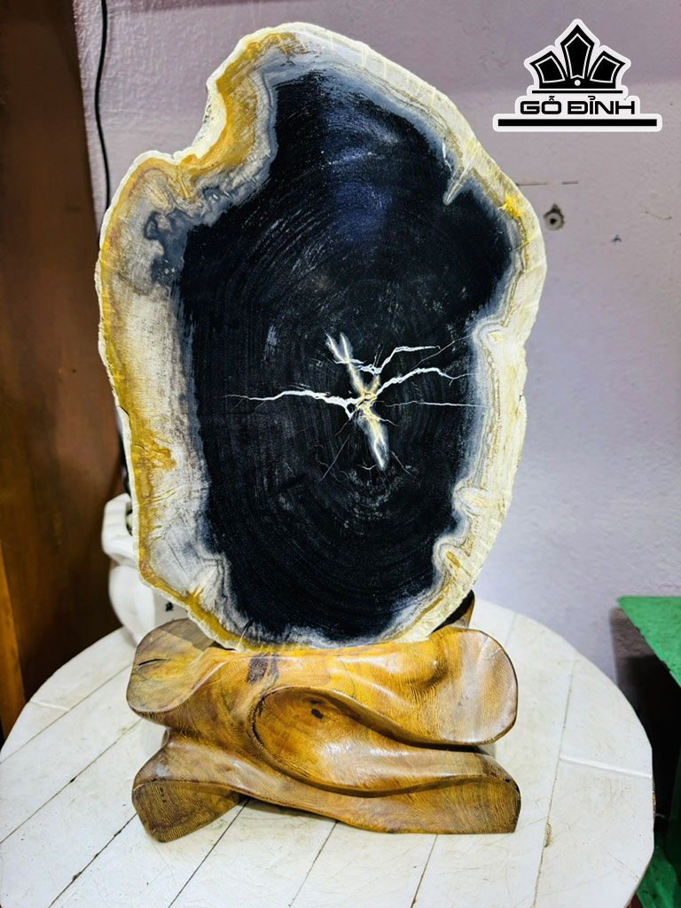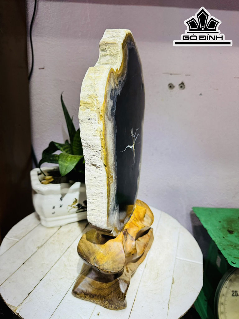 Tác Phẩm Lát Gỗ Hóa Thạch Vân Trắng Đen Cao 38 Ngang 21 Sâu 3 (cm) 4,2kg