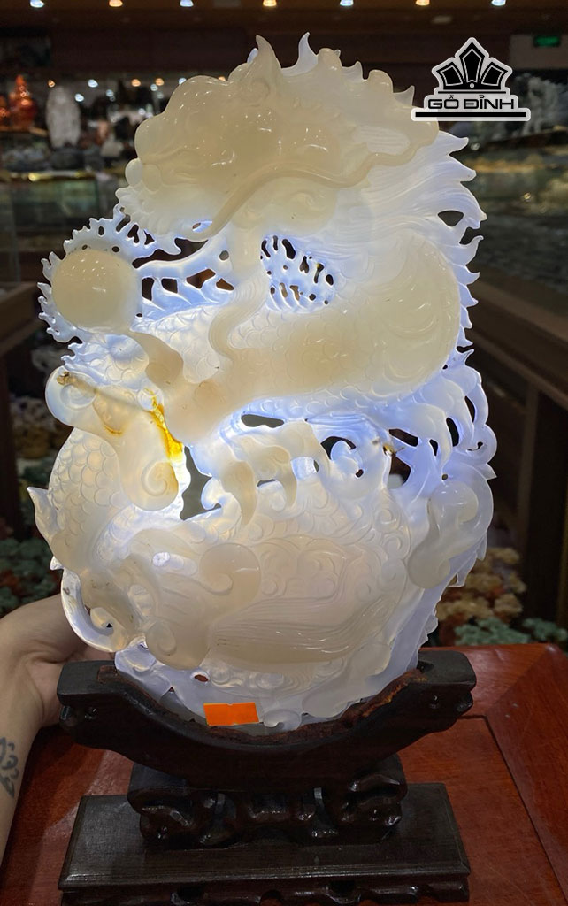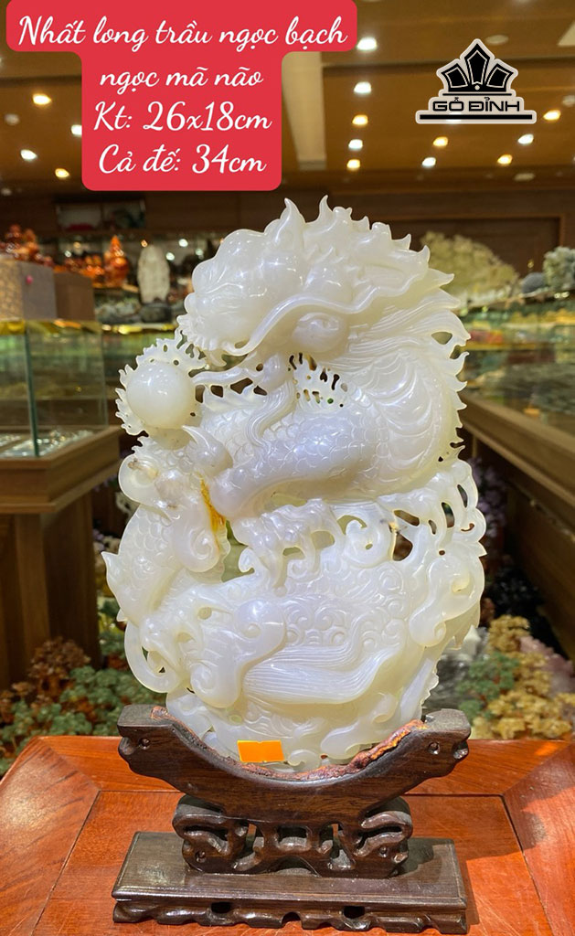 Tác Phẩm Nhất Long Chầu Ngọc Đá Mã Não Cao 34 Ngang 18 Riêng Đá Cao 26 (cm)