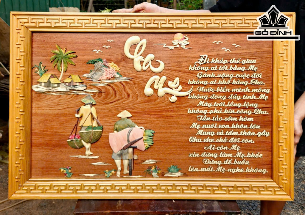 Tranh Cha Mẹ Nền Gỗ Hương Đá - Khung Gáo Kích Thước 69x103x4 (cm)
