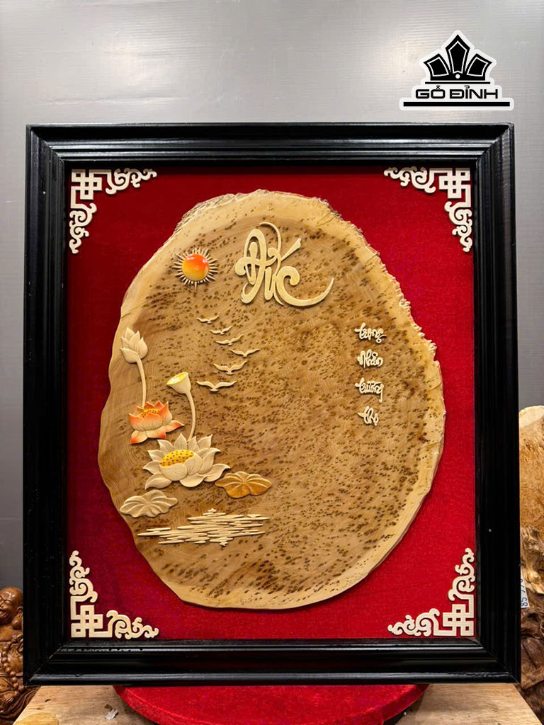 Tranh Chữ Đức Gỗ Nu Ngọc Am - Khung Gỗ Cẩm Vàng 72x82x3 - Mặt Nu 51x62x1 (cm)
