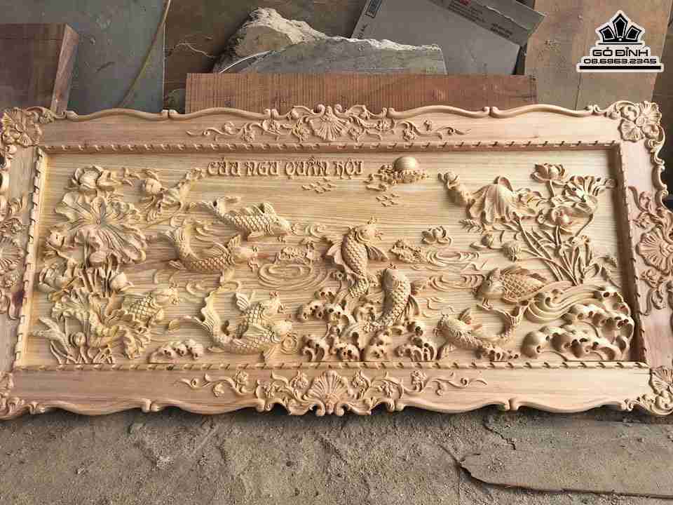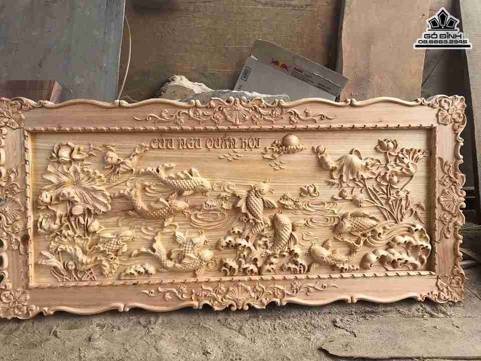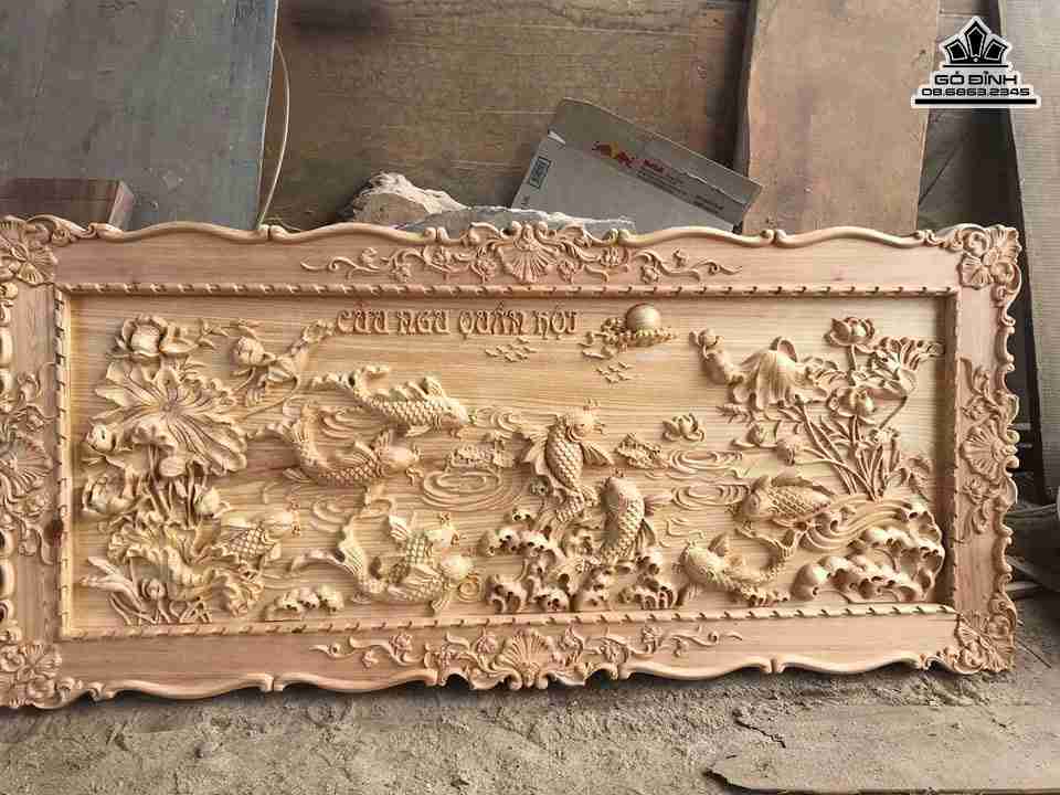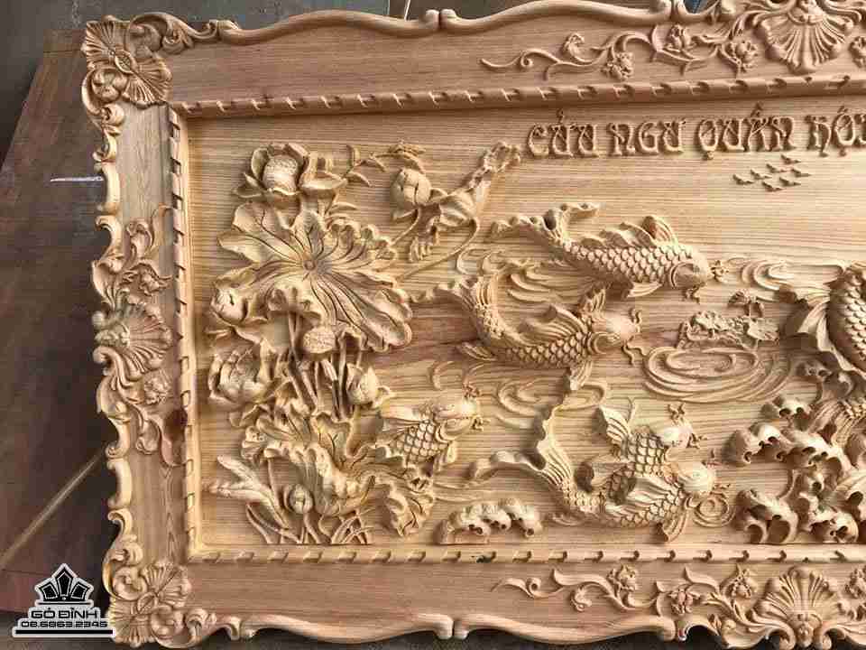 Tranh cửu ngư quần hội gỗ pơ mu cao 62 rộng 1m37 dày 4,5 (cm)