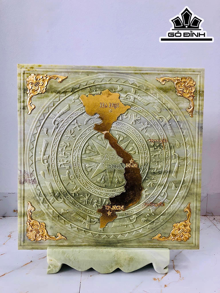 Tranh Đá Trống Đồng Bản Đồ Việt Nam Dát Vàng Đá Serpentine Cao 68 Ngang 68 (cm)