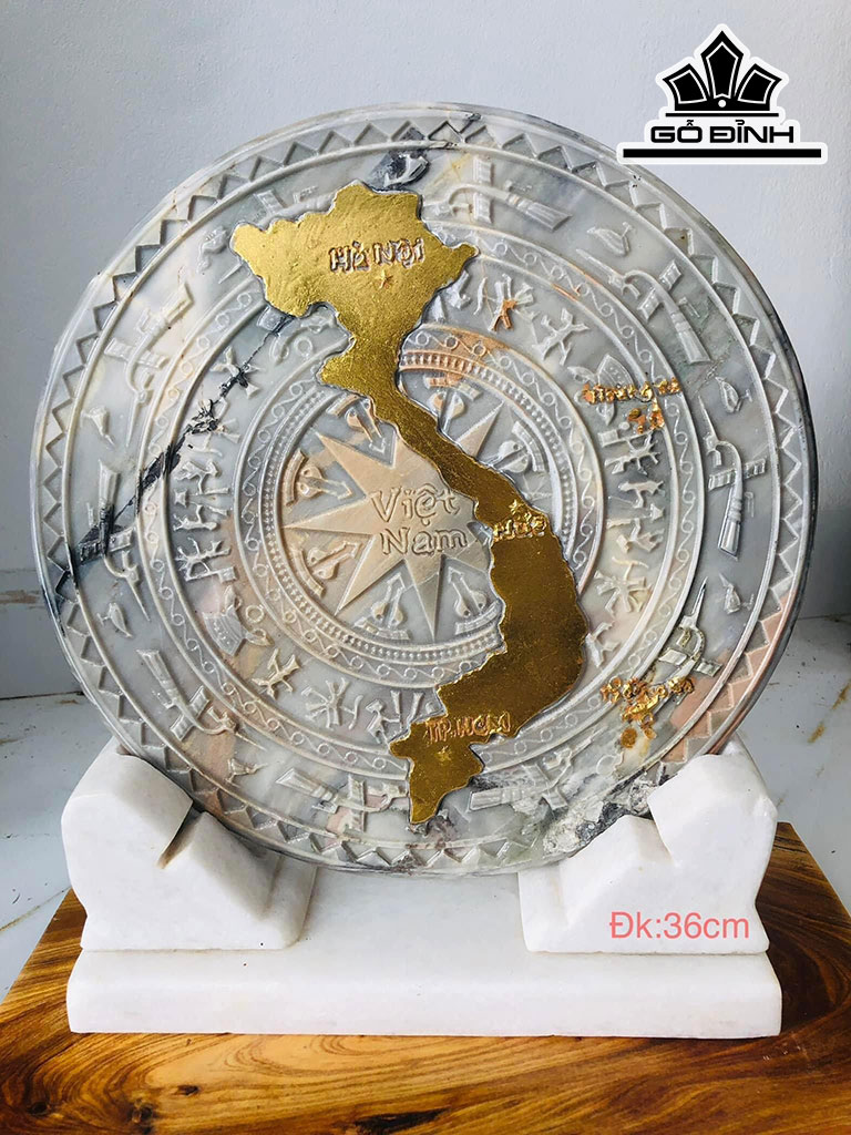 Tranh Đá Trống Đồng Bản Đồ Việt Nam Dát Vàng Đá Serpentine Đường Kính 36 (cm)