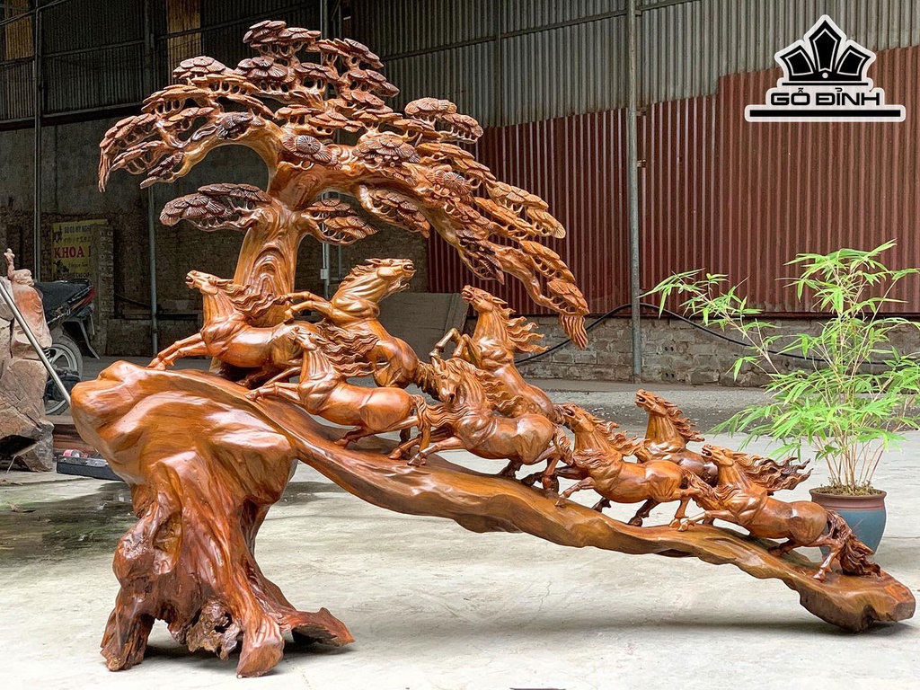 Tượng Bát Mã Gỗ Bách Xanh Ngang 100 Cao 114 Sâu 30 (cm)