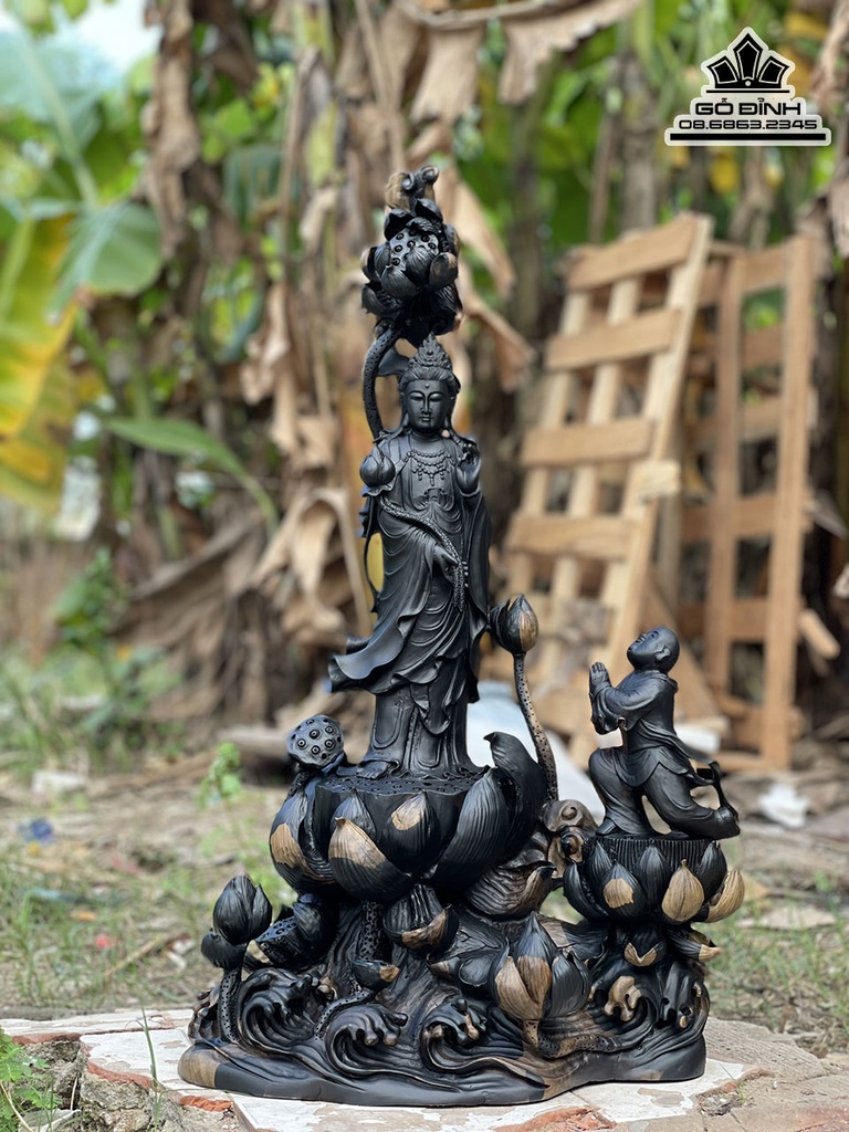 Tượng Bồ Tát Tiểu Đồng Gỗ Mun Sừng Cao 60 Ngang 35 Sâu 23 (cm)
