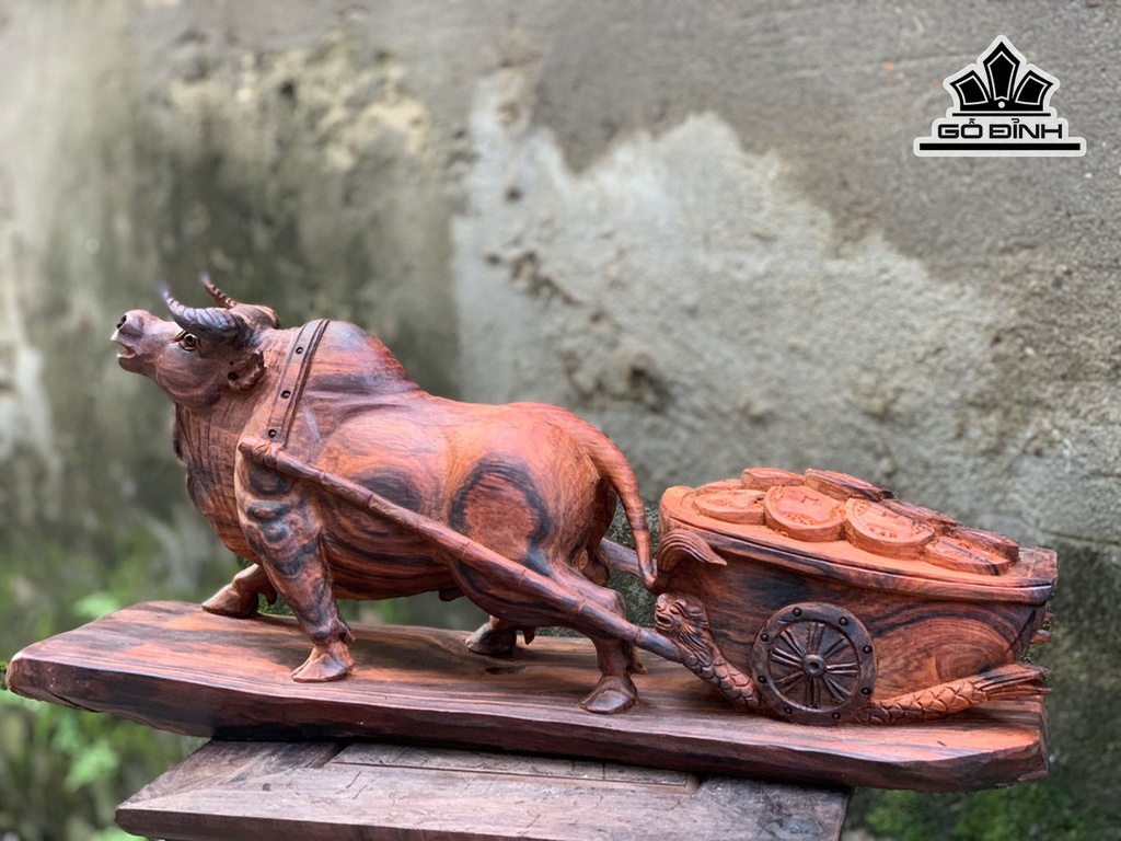 Tượng Bò Tót Kéo Tiền Vàng Gỗ Trắc Cao 22 Ngang 50 Sâu 13 (cm)