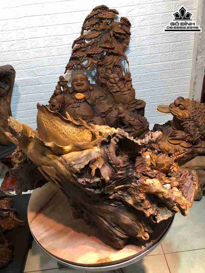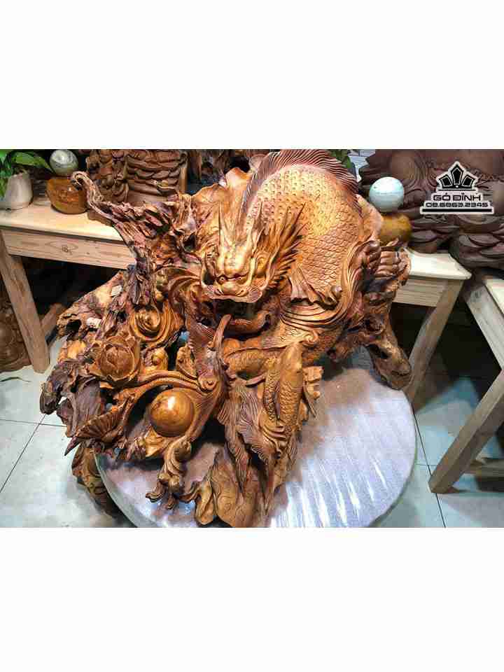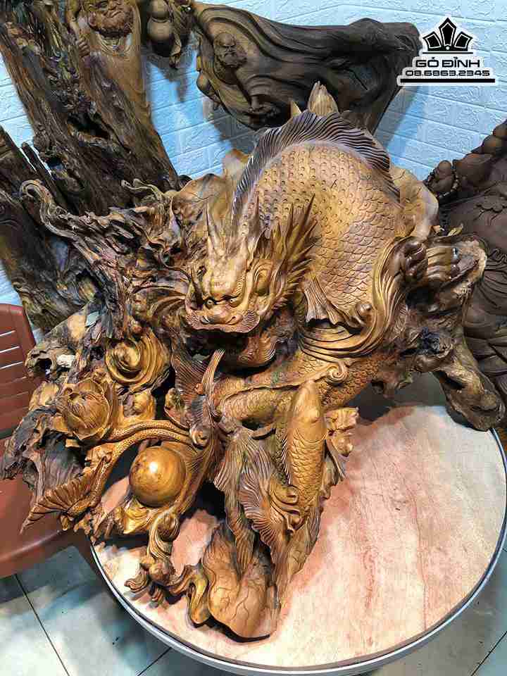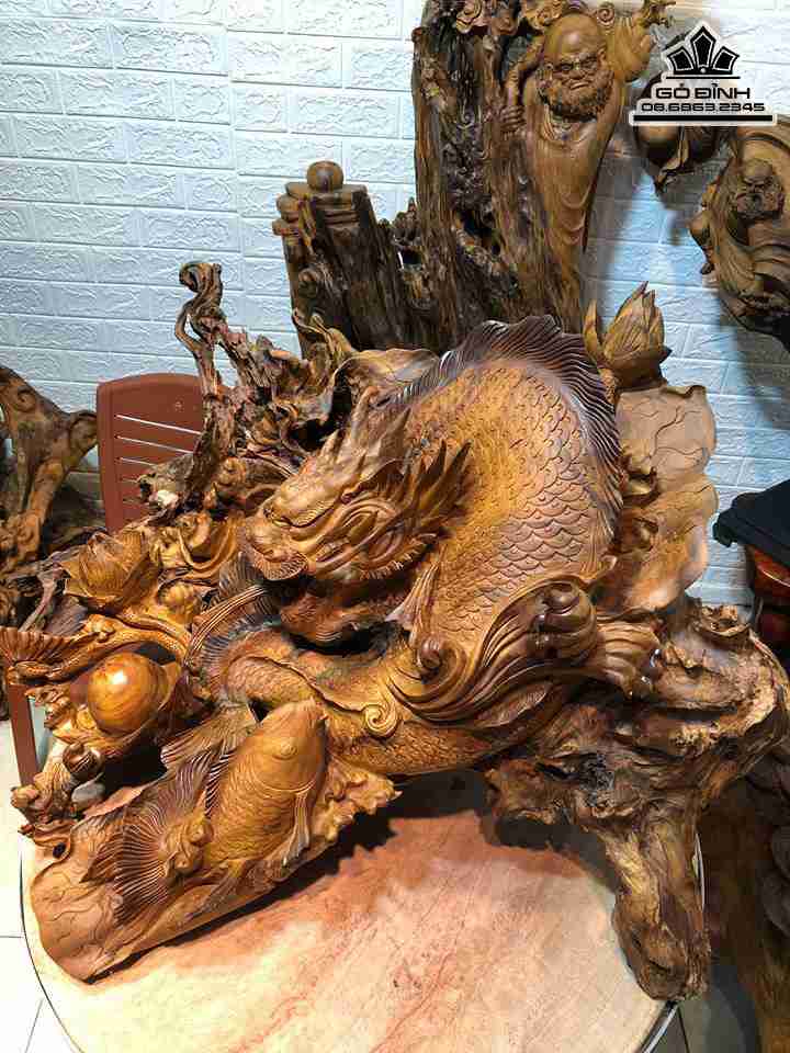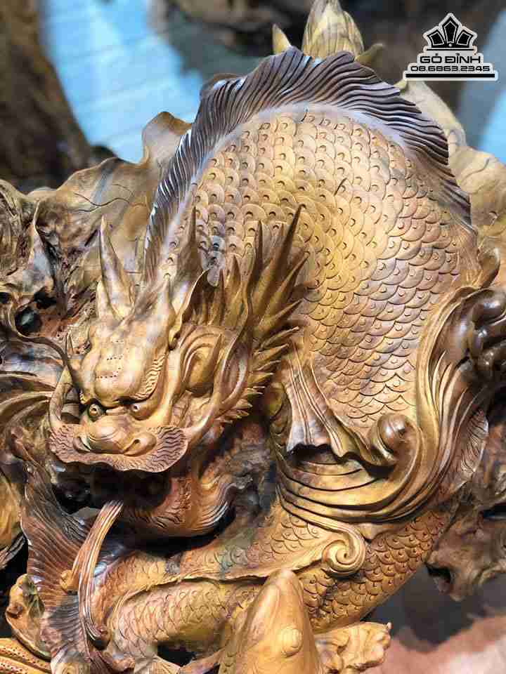 Tượng Cá Chép Hóa Rồng gỗ bách xanh cao 54 rộng 86 dày 56 (cm)