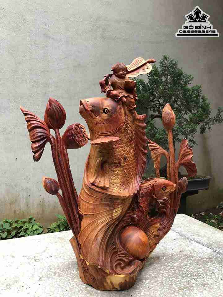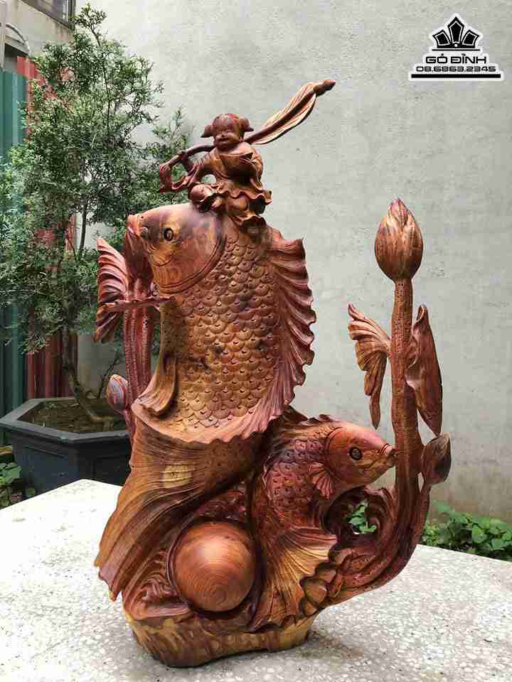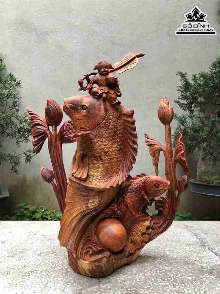 Tượng Cá Chép Mẫu Tử Gỗ Hương Cao 70 Ngang 58 Sâu 26 (cm)