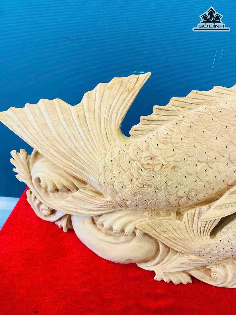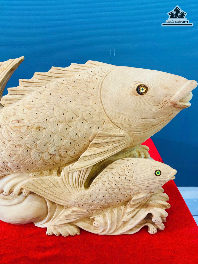 Tượng Cá Chép Mẫu Tử Gỗ Ngọc Am Cao 35 Ngang 58 Sâu 18 (cm)
