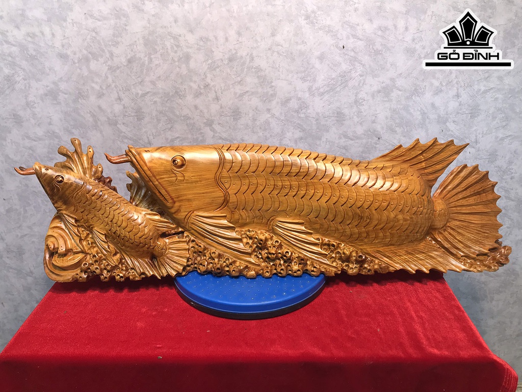 Tượng Cá Kim Long Mẫu Tử Gỗ Ngọc Am Cao 19 Ngang 70 Sâu 12 (cm)