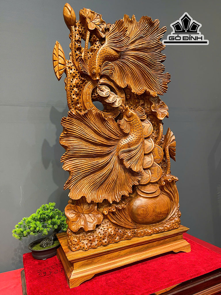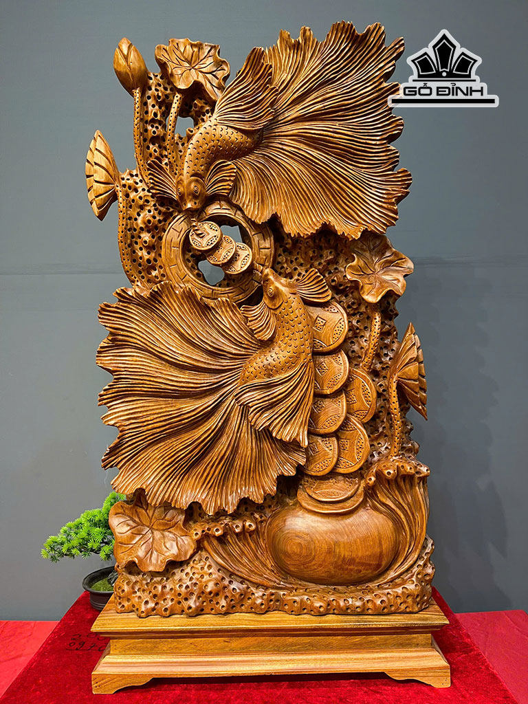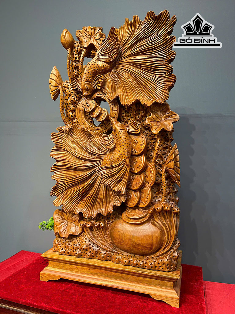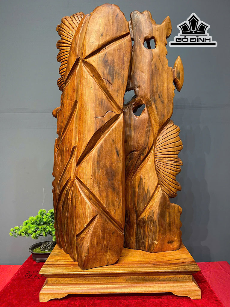 Tượng Cá Xiêm Đôi Gỗ Ngọc Am Cao Cả Kỷ 101 - Riêng Kỷ Cao 10 Ngang 52 Sâu 25 (cm)