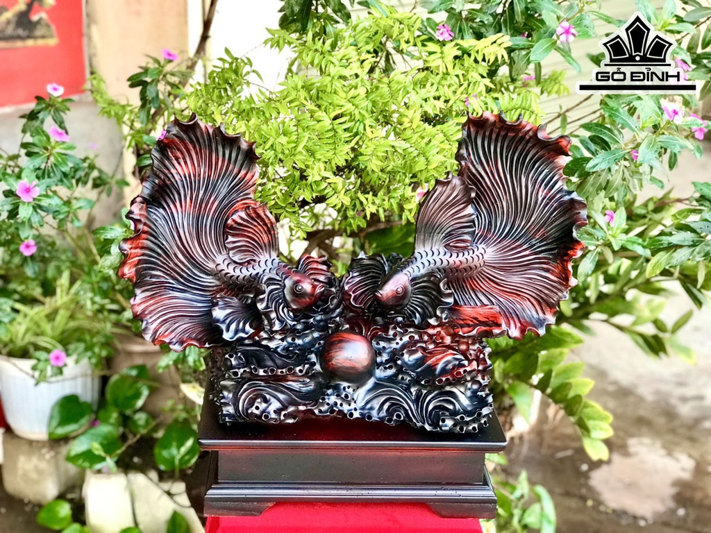 Tượng Cá Xiêm Đôi Gỗ Trắc Cao 45 Ngang 55 Sâu 25 (cm)