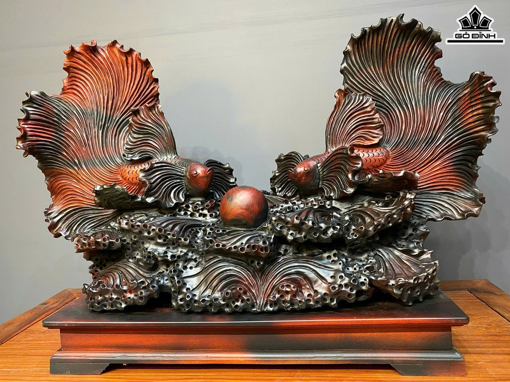 Tượng Cá Xiêm Đôi Gỗ Trắc Cao Cả Kỷ 66 Ngang 100 Sâu 38 (cm) - Kỷ Cao 10 (cm)