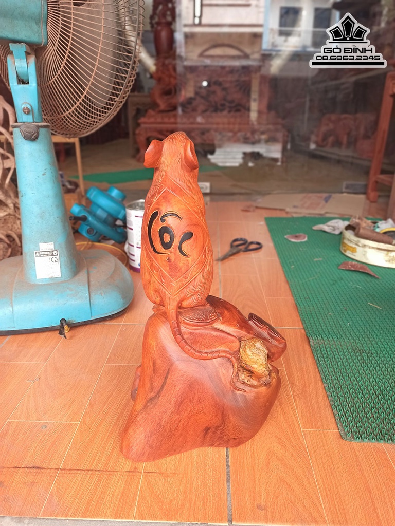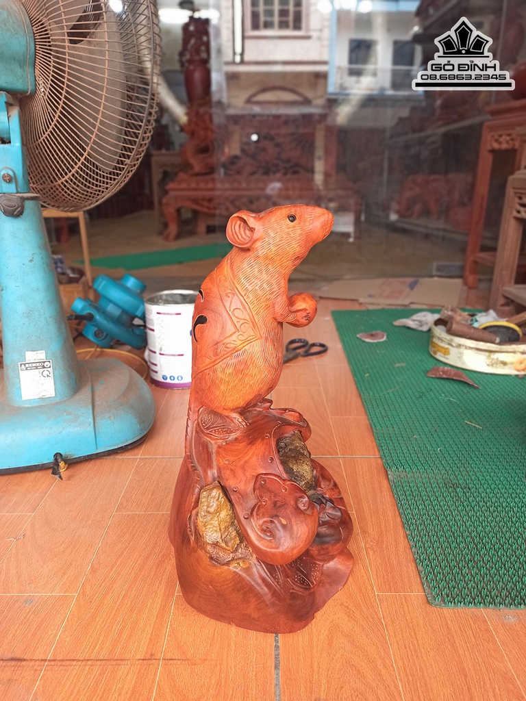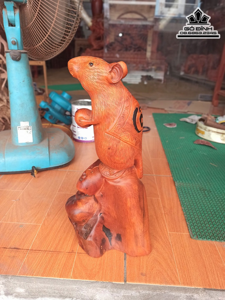 Tượng Chuột Gỗ Hương Ôm Đá Cao 40 Ngang 20 Sâu 20 (cm)