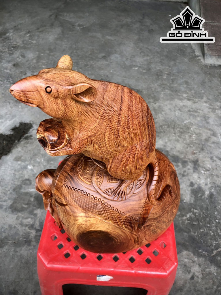 Tượng Chuột Ngồi Bao Tiền Gỗ Hương Cao 30 Ngang 25 Sâu 15 (cm)