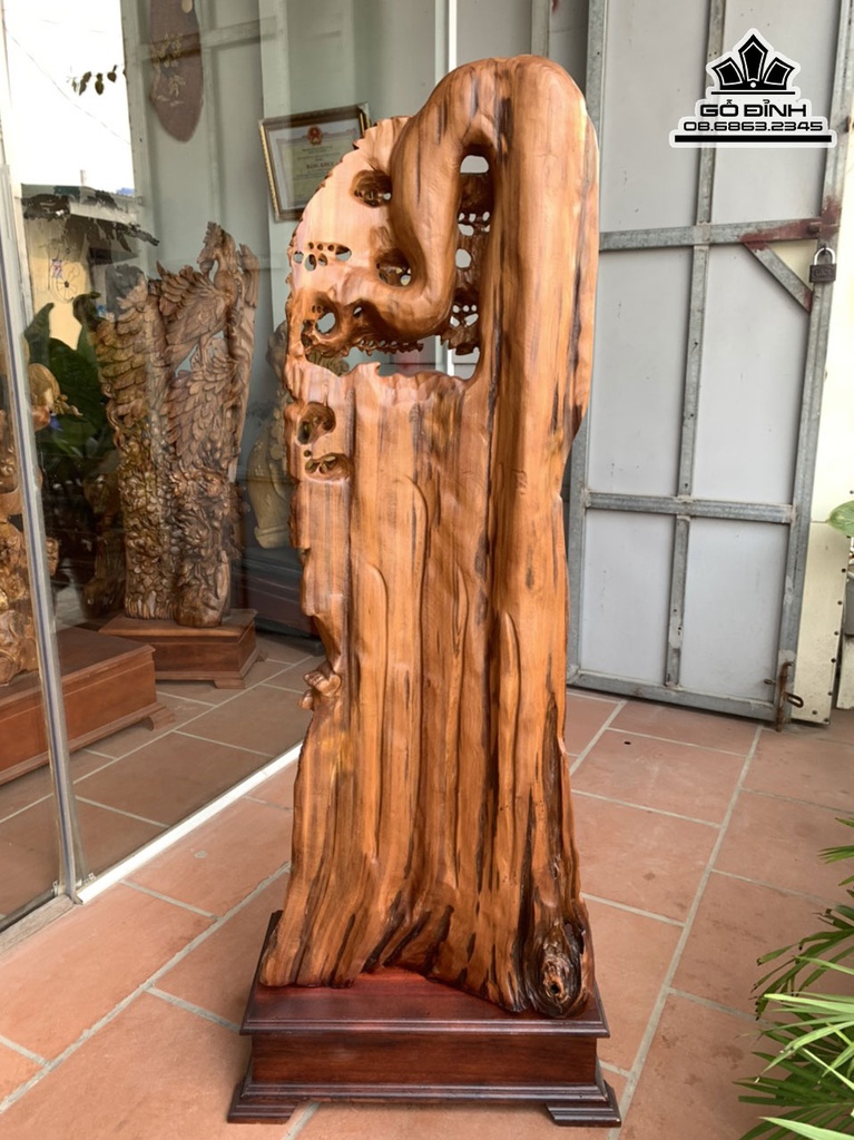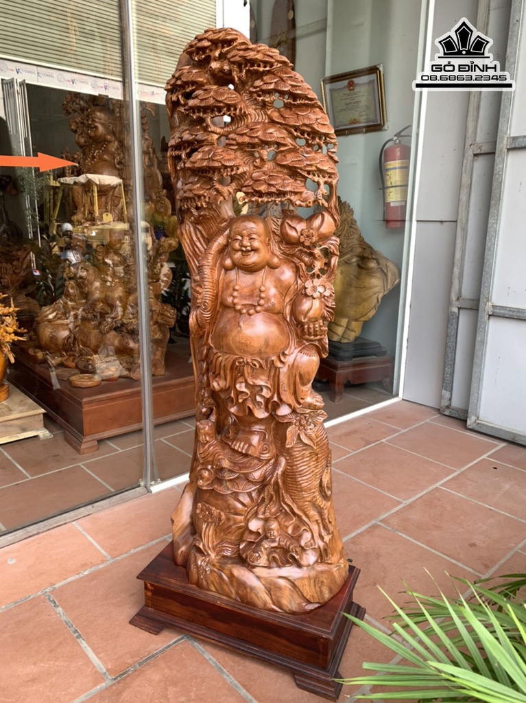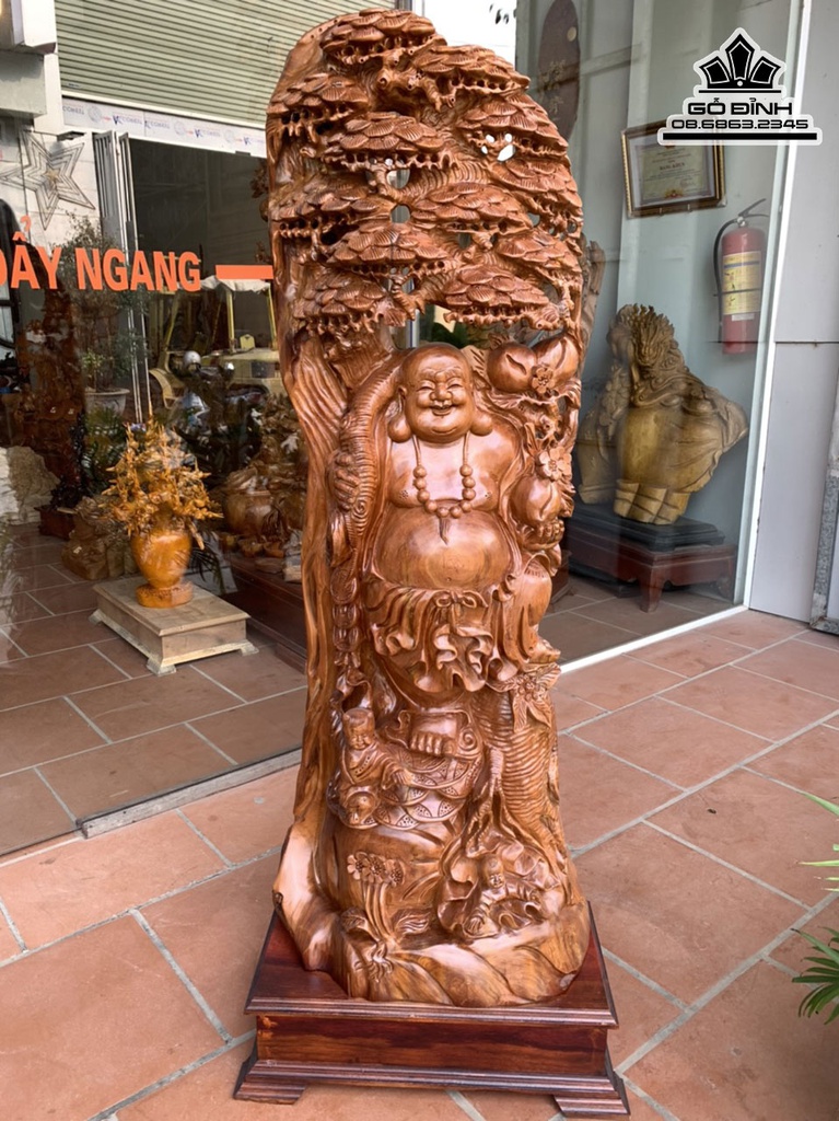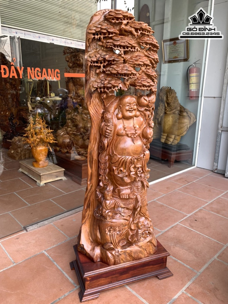Tượng Di Lặc Đứng Gốc Tùng Gỗ Ngọc Am Cao 130 Ngang 50 Sâu 26 Cả Kỷ 145 (cm)