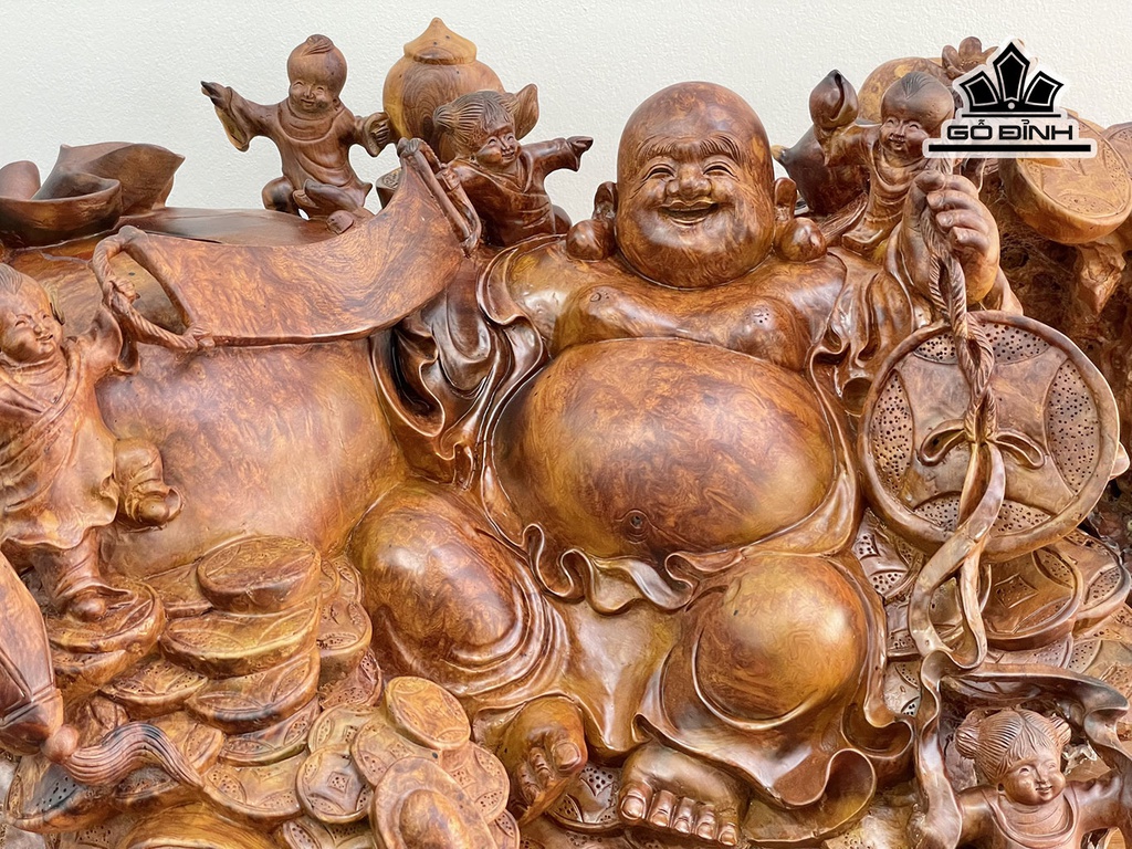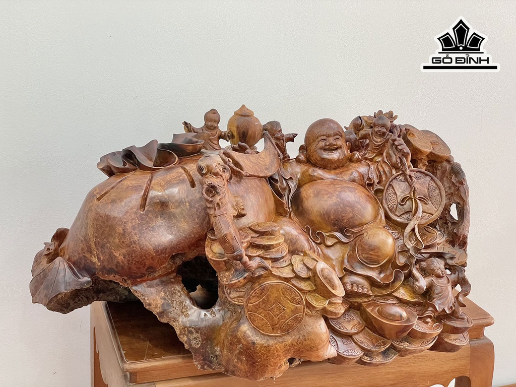 Tượng Di Lặc Ngồi Bao Tiền Gỗ Nu Hương Cao 40 Ngang 90 Sâu 64 (cm)