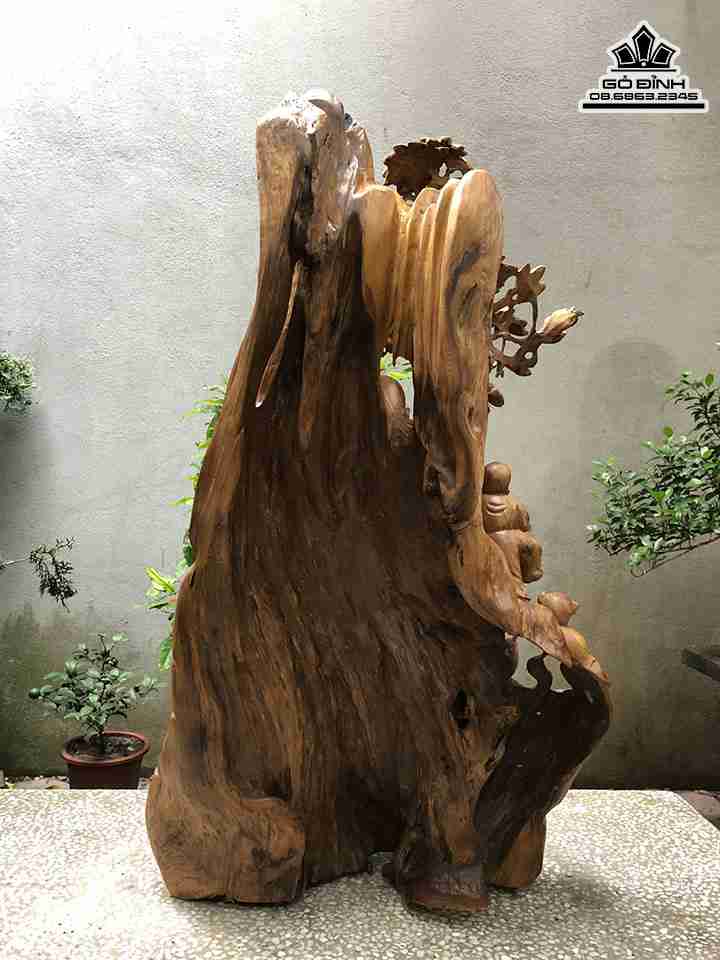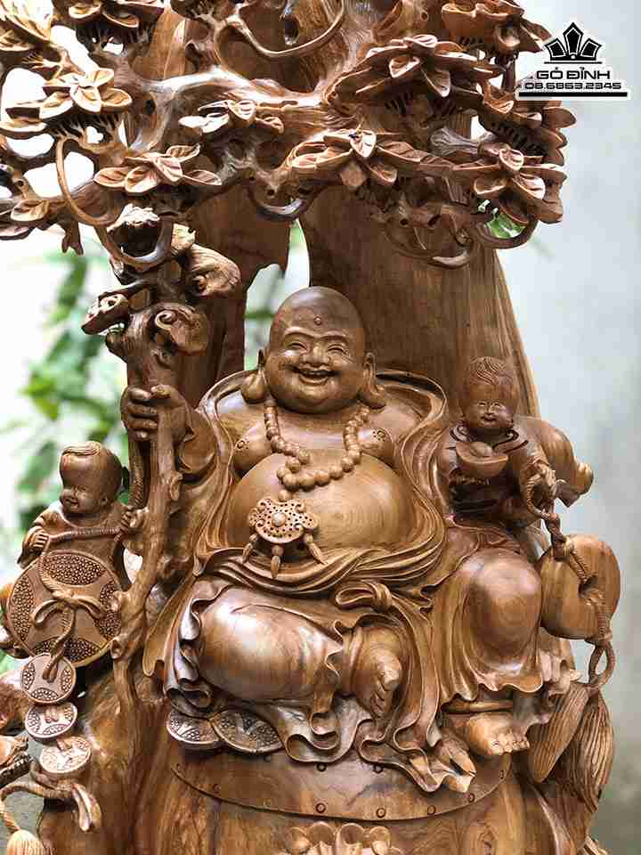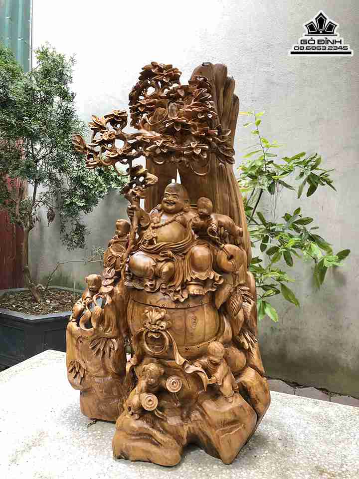 Tượng Di Lặc Ngồi Gốc Gỗ Bách Xanh Cây Tùng Cao 96 Ngang 56 Sâu 35 (cm)